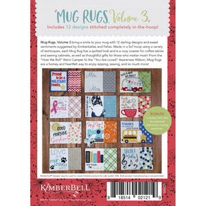 Get ready to have some embroidery fun with Kimberbell Holiday & Seasonal Mug Rugs, Volume 3. Each of the twelve delightful designs has a quilted look when completed. These cozy coasters can be made in a 5 x 7 hoop using an array of techniques.