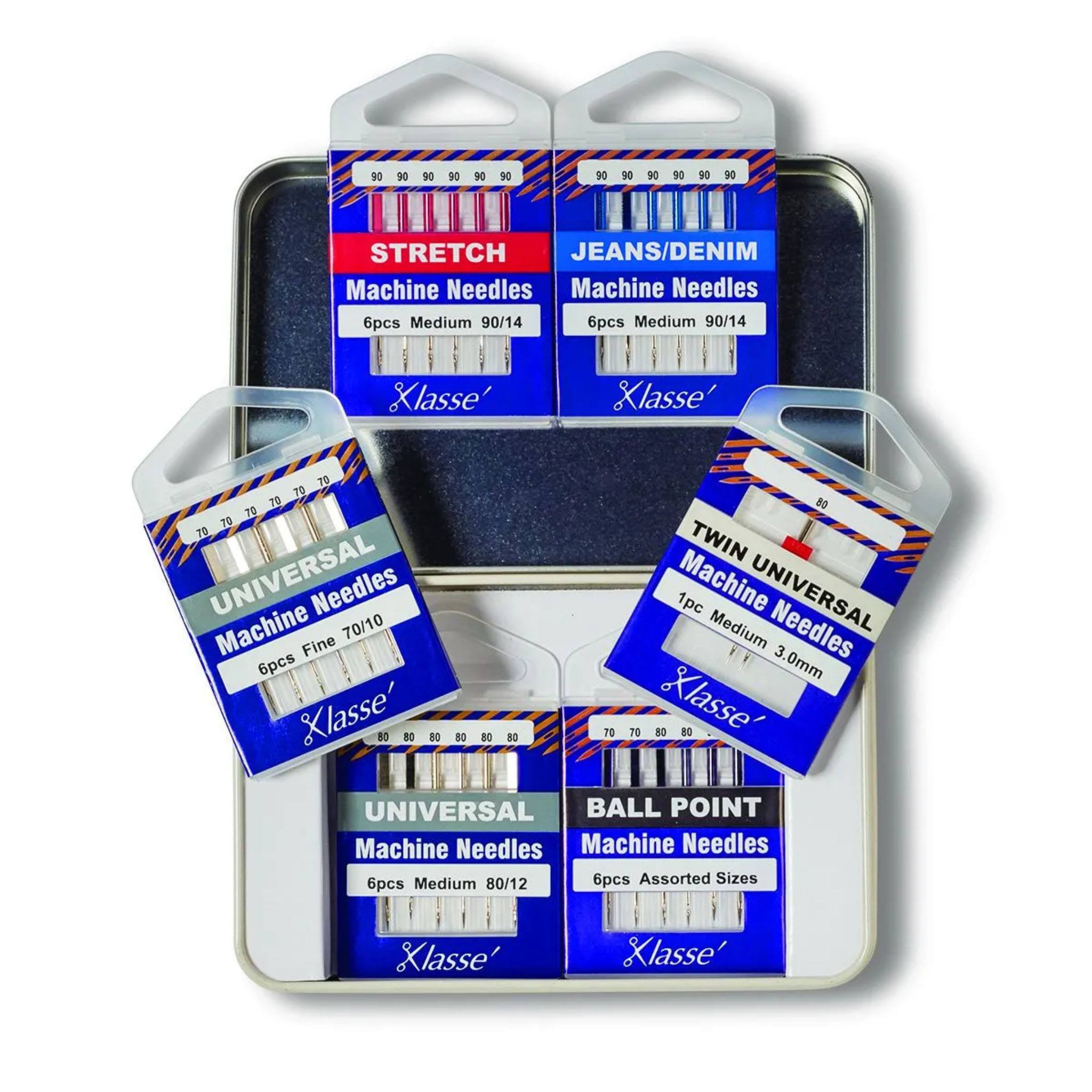 This Klasse Garment Needle Set includes the essential garment sewing needles. This kit contains six different needle options and also has a QR code for an instructional video about when to exchange your needles. The video even explains how to change your needle, the uses of each needle, and more! This collection of needles is more efficient for sewing clothes or other heavier materials. Included in this kit are Klasse Universal 80/12, Universal 70/10, Stretch 90/14, Twin Universal 3.0mm, Jeans 90/14, and Ballpoint. The Ballpoint needles are an assortment of (2) 70/10, (2) 80/12, (2) 90/14.