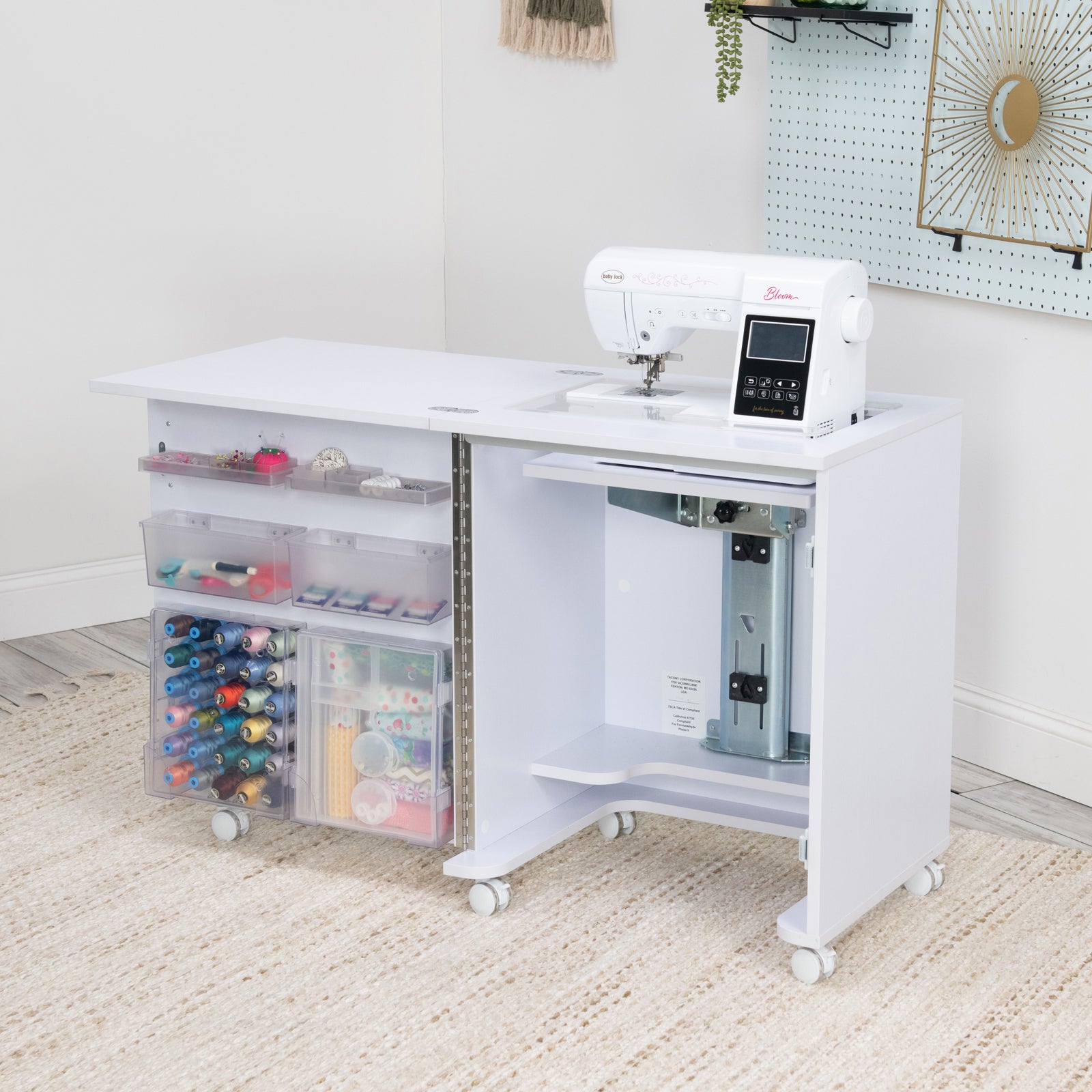 Its three-position hydraulic lift allows you to effortlessly raise or lower your machine for flatbed, free-arm, or storage positions, ensuring ergonomic comfort for every project. Built-in thread and accessory storage boxes keep your essentials neatly organized and always within reach, while easy-roll, lockable casters let you move your cabinet anywhere with ease—and secure it firmly when it’s time to sew.