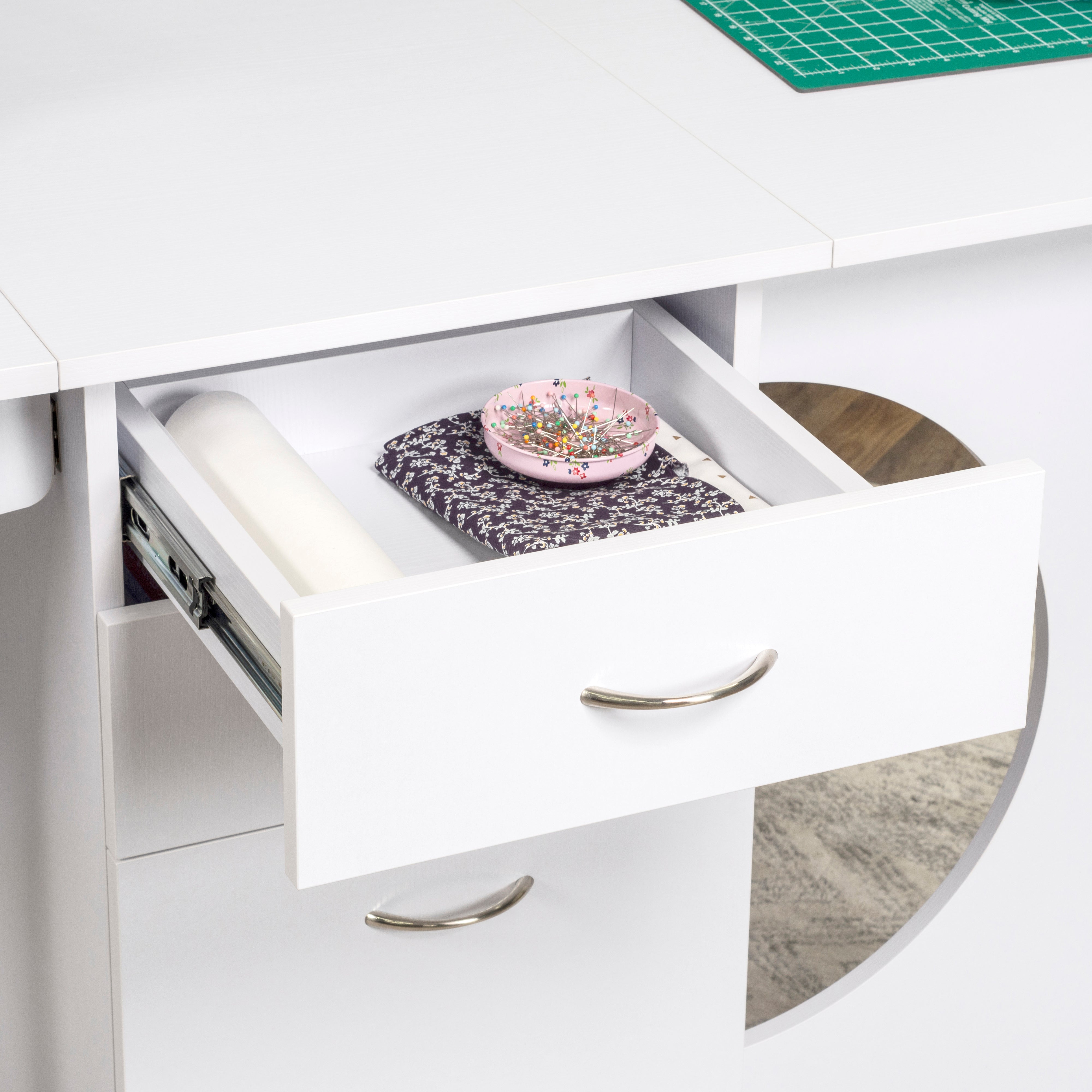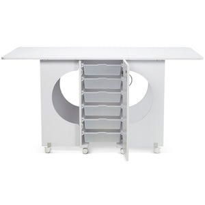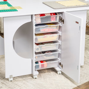 Stay effortlessly organized with the Koala Cutting Table’s smart storage system, thoughtfully designed to keep every sewing and crafting essential right where you need it. Behind its sleek exterior, you’ll find three spacious drawers for tools, notions, and patterns, plus six removable storage bins—ideal for sorting fabric, trims, and accessories by color or project.