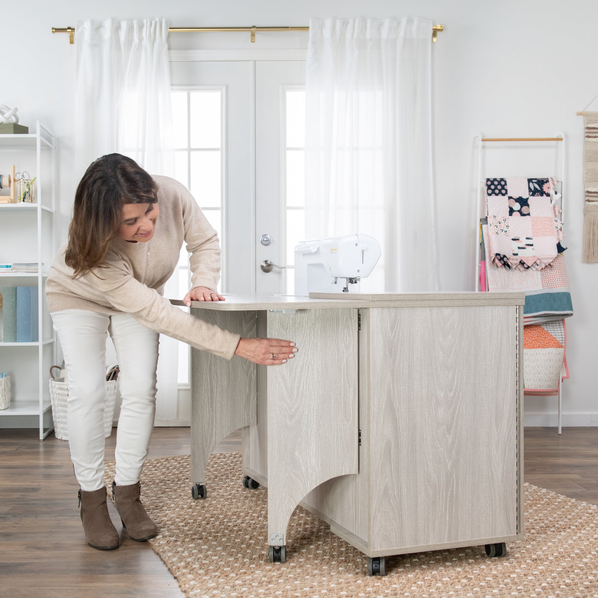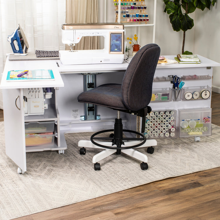 Built with durable, precision-engineered mechanics, the Touch-Release Lift glides seamlessly between levels, supporting even the heaviest machines with ease. When you’re done sewing, simply lower your machine into the cabinet to protect it from dust and free up workspace. This intuitive system takes the strain out of setup, so you can focus on what matters most — your creativity.