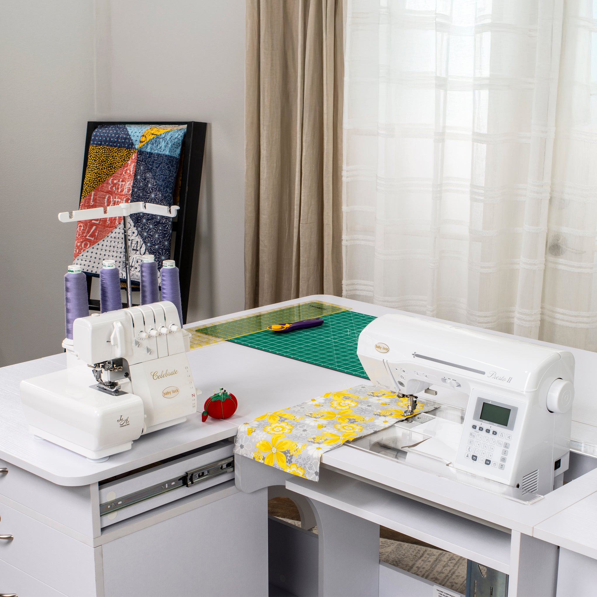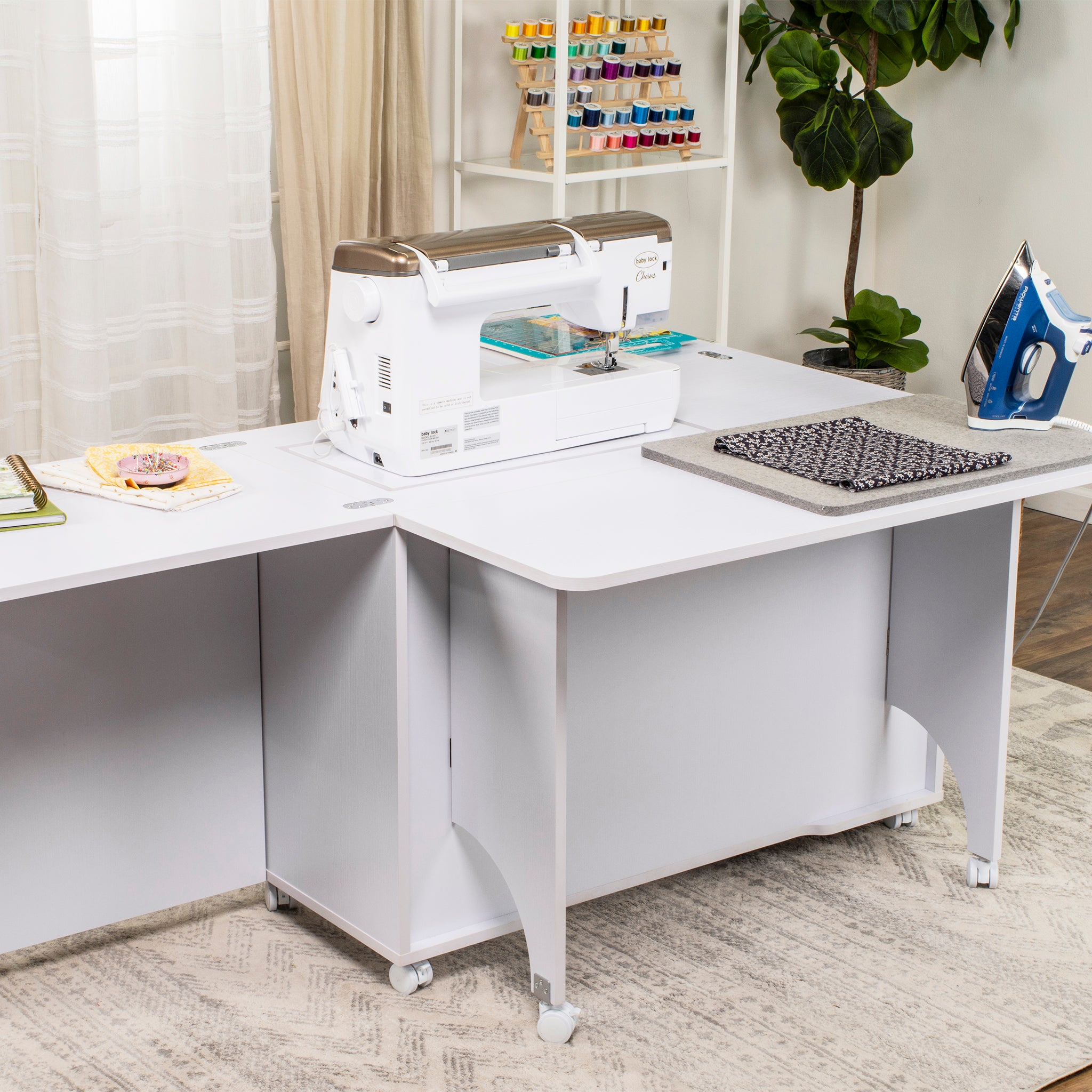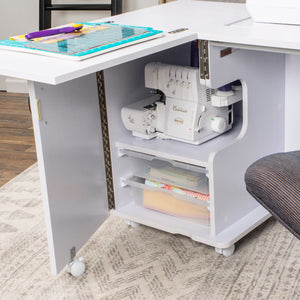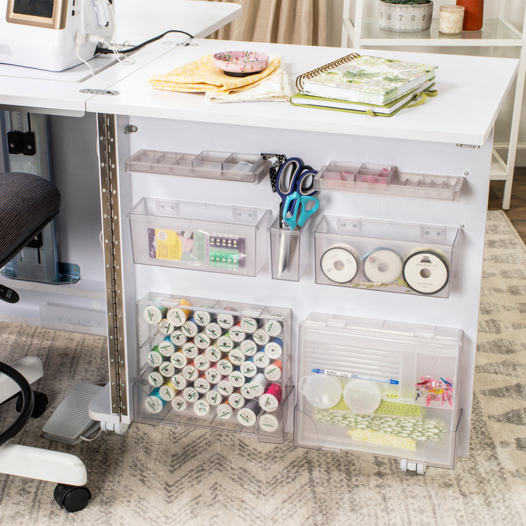 Every detail of the Eclipse is designed for efficiency and comfort. Integrated shelves and fabric bins keep your materials close at hand, while dedicated thread and accessory storage boxes make it easy to stay organized. The easy-roll, lockable casters let you reposition your cabinet effortlessly — then lock it securely in place once you’re ready to sew. Best of all, it comes fully assembled, so you can get right to creating the moment it arrives.