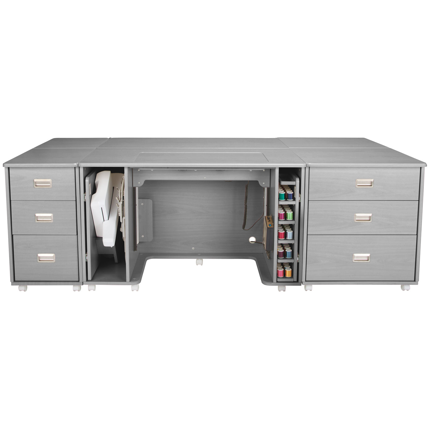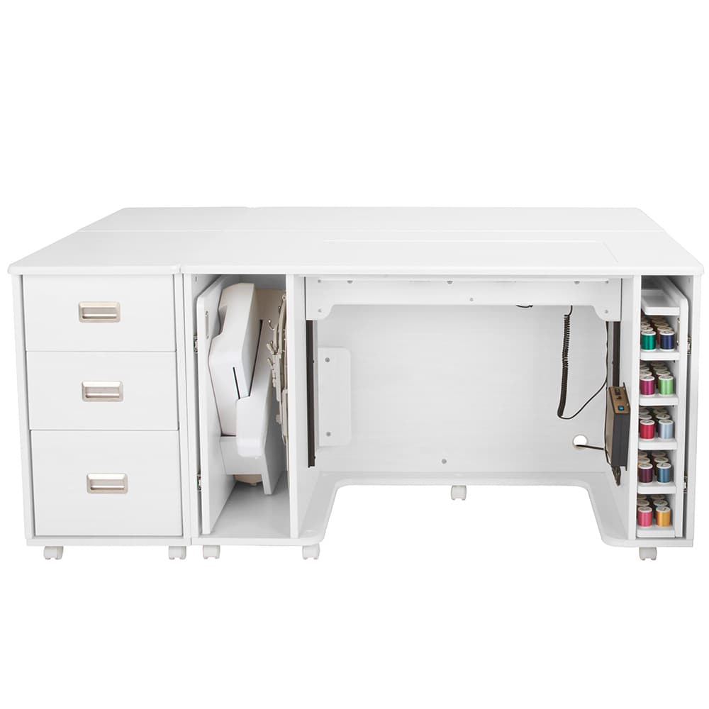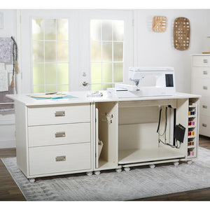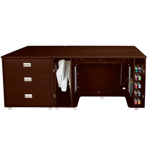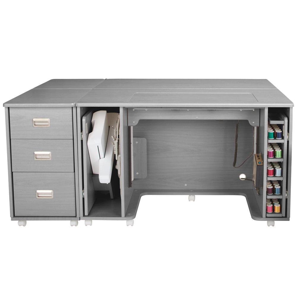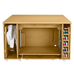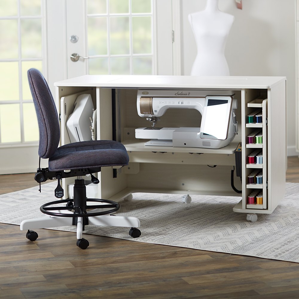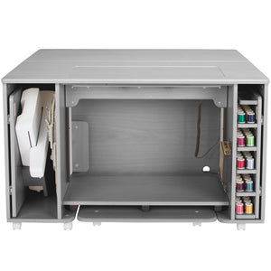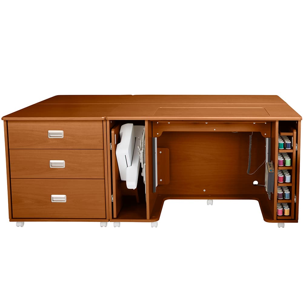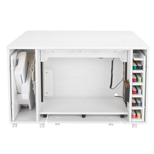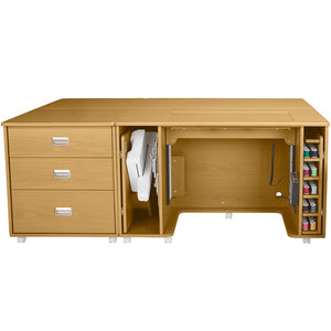 This luxurious table houses your serger, and includes a lift-up storage compartment with soft-close hinges. It’s truly a must-have for your dream sewing studio, crafted with the finest materials for lasting elegance.