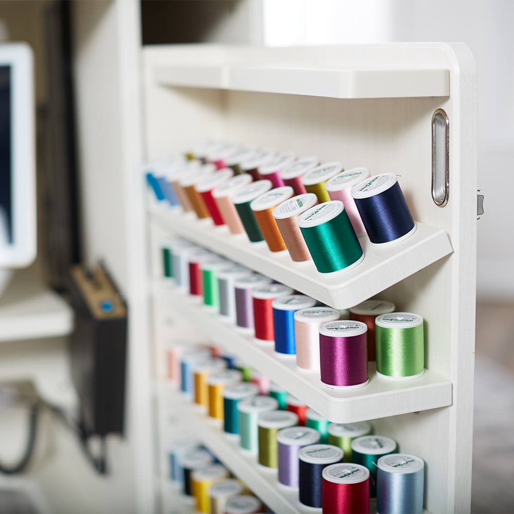 Keep all your colors within reach with the Embroidery Center's Glide-Out Thread Closet. Store up to 100 spools of thread (up to mini-king size) on steel pegs, with magnetic tilt-down shelves for easy access to the back row of spools. Along the top of the closet are two recessed shelves that can hold your cabinet's remote, needles, scissors, seam rippers, and other small notions.