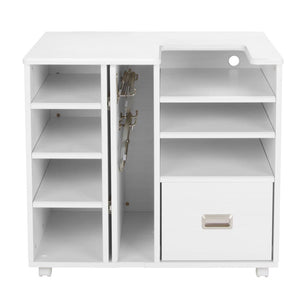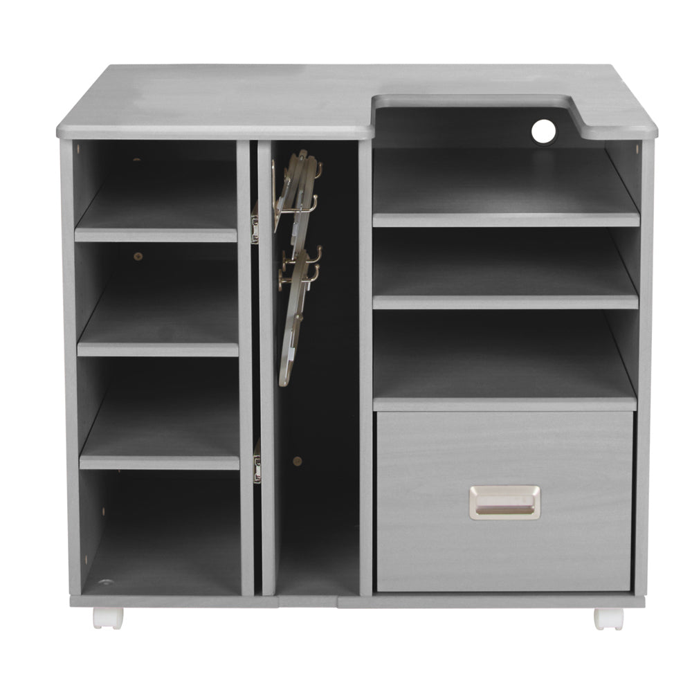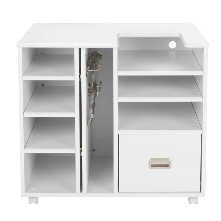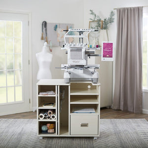 Exceptional design meets unmatched quality in the versatile Koala Studios Embroidery Center Pro. The perfect embroidery table for your projects with flexible sewing storage. When you are limited on space but still want to create a studio setting for your multi-needle embroidery machine, the Embroidery Center Pro is ideal. Measuring 32-1/2” tall by 36” wide and 24-5/8” deep, this cabinet leaves a small footprint in your sewing room. Multiple storage shelves, a sizeable soft-closing drawer, easy-roll, lockable casters, and a glide-out hoop closet can all be found on the Embroidery Center. The Embroidery Center Pro can be used alone as an embroidery table or as a vital part of your complete sewing room organization solution.