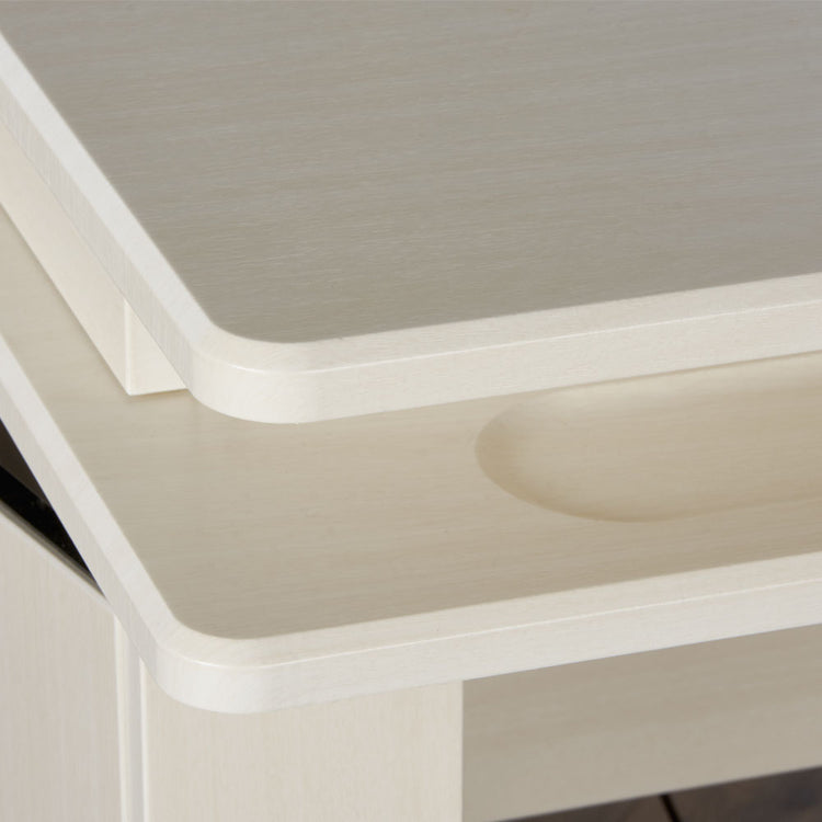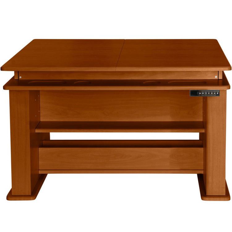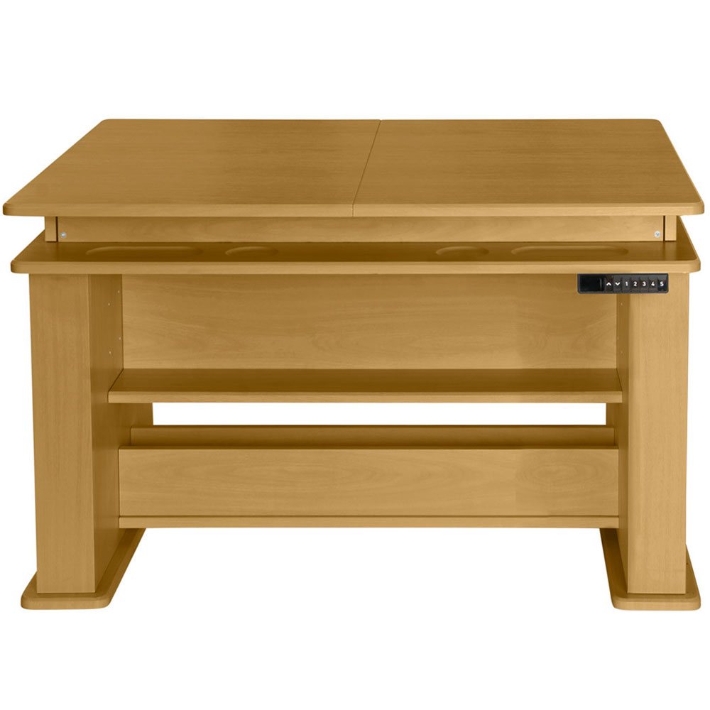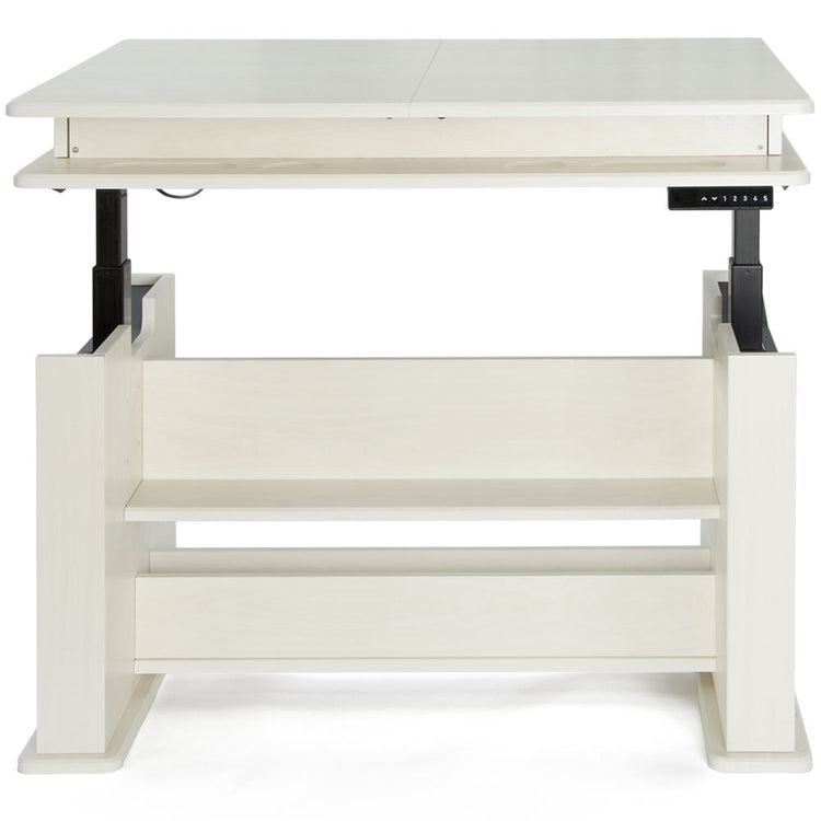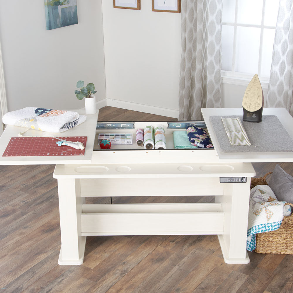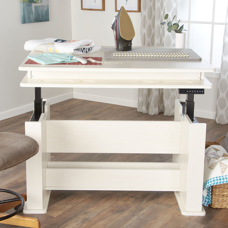 Whether you’re searching for a cutting table for fabric or the ultimate sewing and craft table, this piece of sewing furniture is for you! The Height Adjustable Center allows you to sew, craft, quilt, or cut at both sitting or standing height, from 29 1/4" to 48". Extension panels extend your fabric-cutting table space from 45 inches to 75 inches wide. And, a felt-lined storage alcove adds additional sewing storage right where you need it.