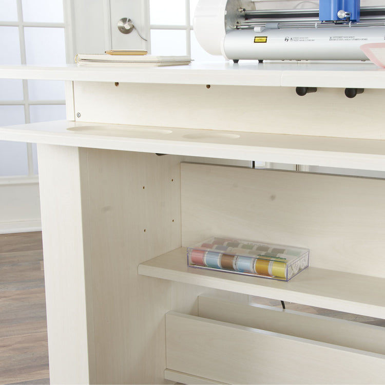 The Koala height adjustable center has a built-in adjustable storage shelf below the work surface. This provides lots of space for you to organize and store your favorite notions, tools, and supplies.