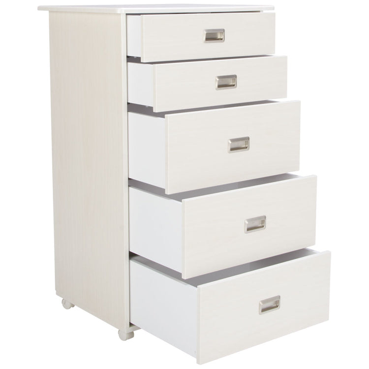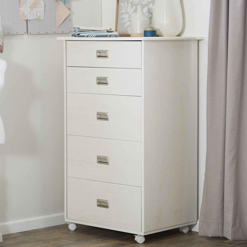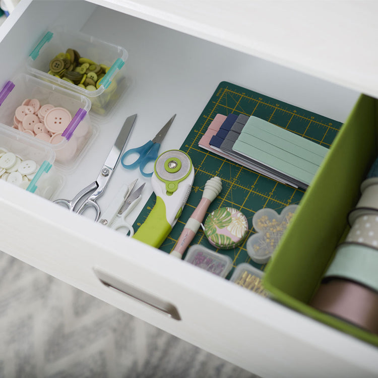 This storage tower features five spacious, soft-closing storage drawers. Never worry about running out of space for your fabric stash, notions, and sewing machine thread.
