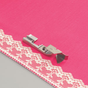 Serge the finest lace and delicate trims without damaging the header of the trim. The adjustable guide will keep your serging accurate as well as ensure that your lace stays intact. Your lace projects will be finished with an expert look in the exact style you want. Click here to view the instructions for this foot.