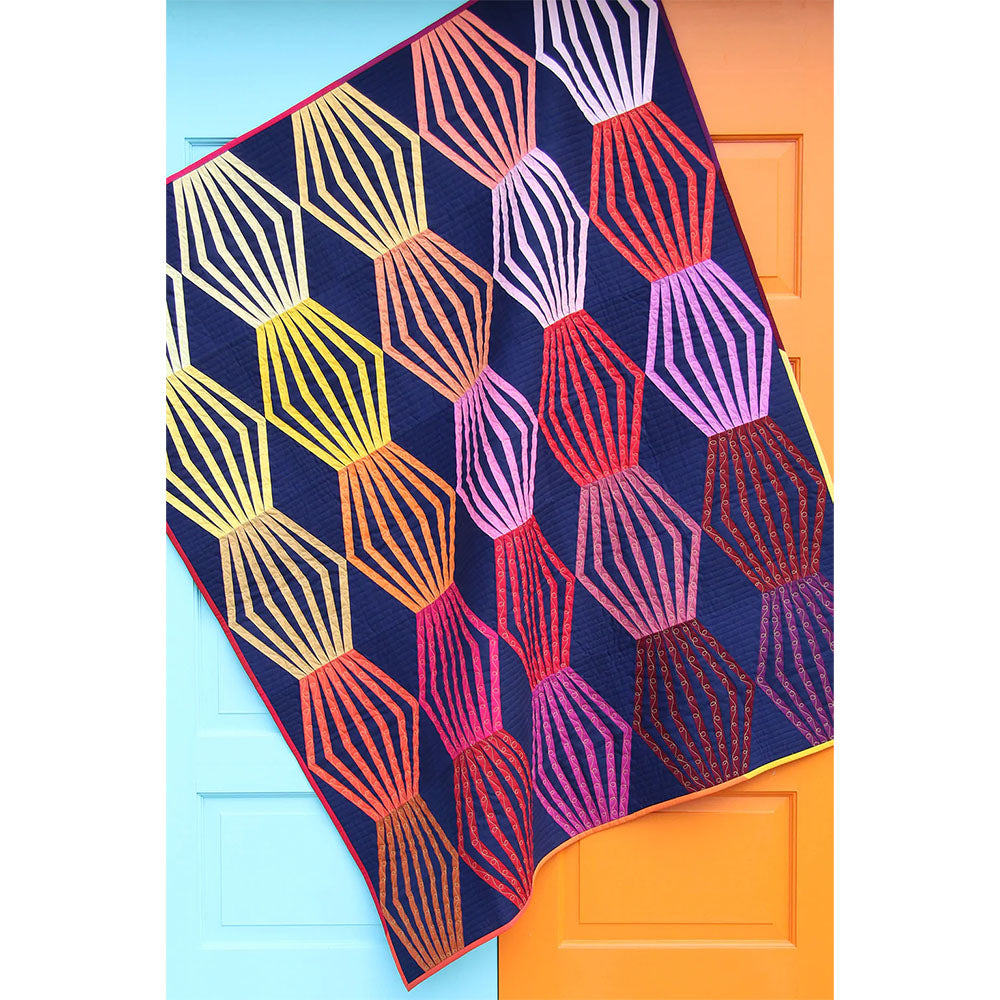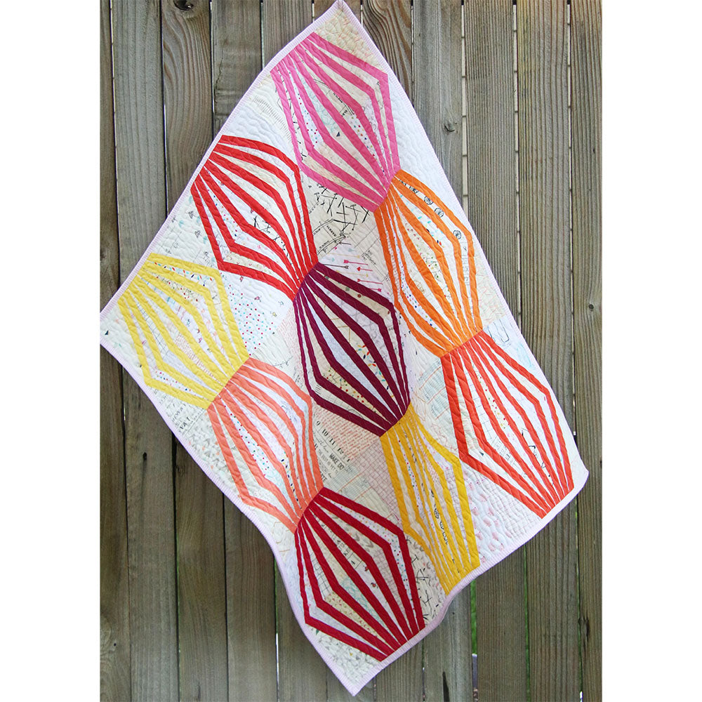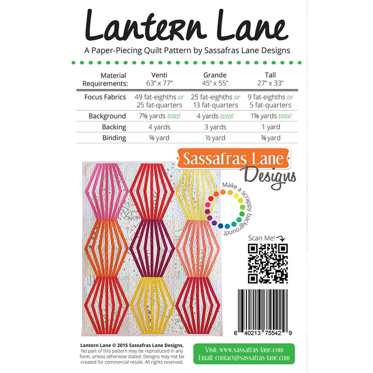 The Lantern Lane Quilt Pattern by Sassafras Lane Designs, inspired by hanging lanterns in Chinatown in San Francisco, will add a simple yet pleasing touch to any space. This beginner paper-piecing quilt can finish in three different sizes; 27" by 33", 45" by 55", or 63" by 77". The Lantern Lane Quilt Pattern by Sassafras Lane Designs also includes instructions, a list of suggested materials, full-size foundations, a coloring sheet, and cutting sizes for paper-piecing sections.