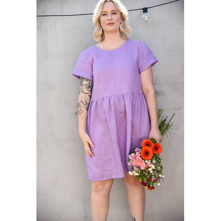 The Lanti Swing Dress Pattern from Sew to Grow is versatile, offering three lovely design options to fit your style. Try the alluring smock dress with a gathered waist, a sleek, flattering A-line dress with pockets, or a basic yet eternally stylish top that will be a wardrobe favorite. Add short sleeves with a band or a 3/4 sleeve with a frill. Lanti Swing Dress Pattern features side darts, a faced neckline, and a back button closure for leisurely wear. It is the perfect pattern to learn the basics of dressmaking while adding creative pieces to your wardrobe. Sizing ranges from (8 - 22). The Lanti Swing Dress Pattern has detailed instructions and a suggested list of materials.