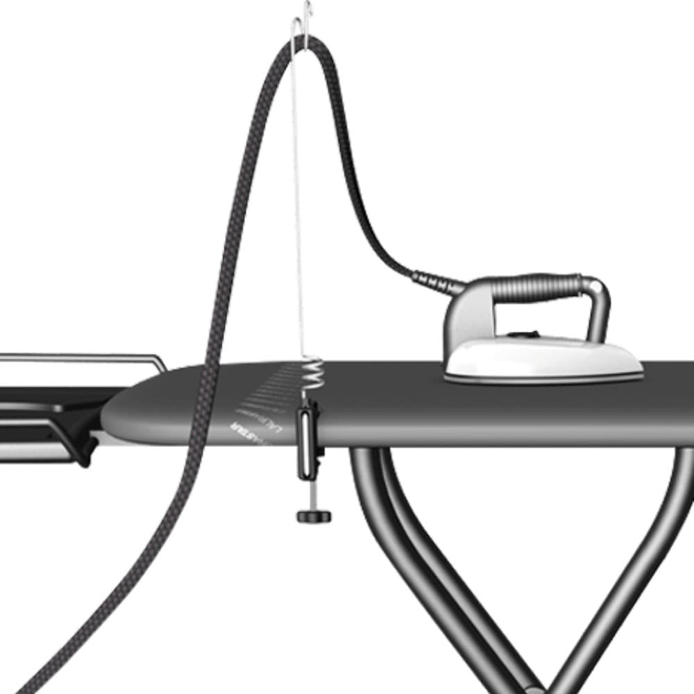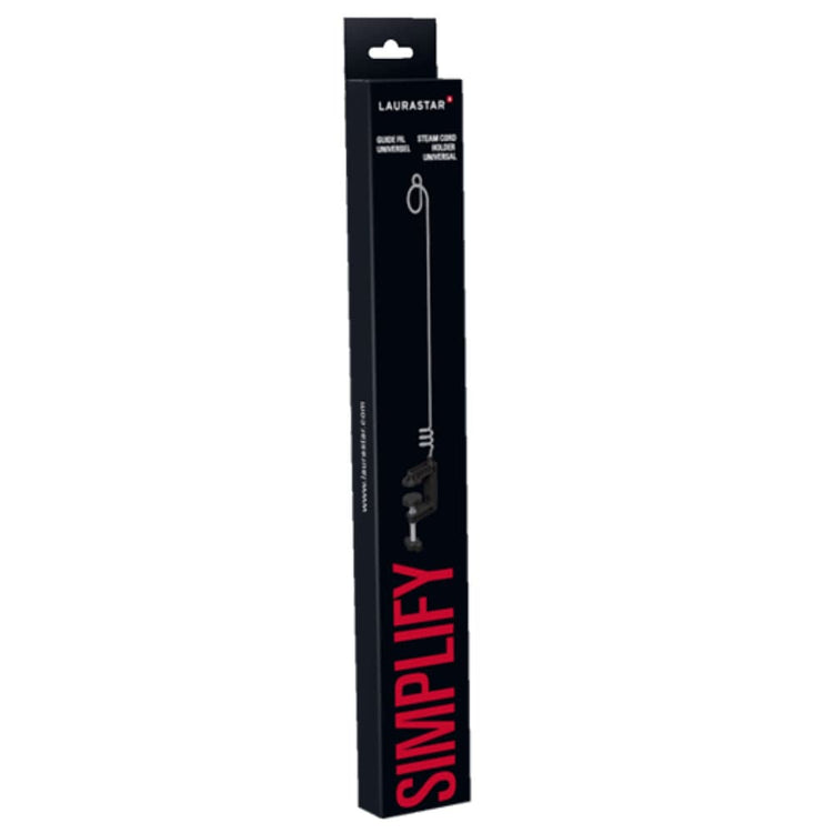 The easily attachable Laurastar Universal Steam Cord Holder guides the steam cord up and out of the way, making ironing more comfortable. The universal clip is easy to secure to your board and can remain attached even when stored away.