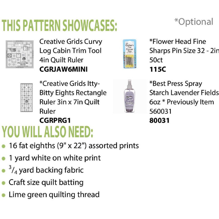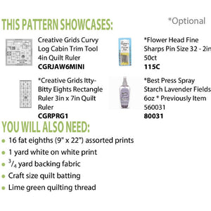 From Cut Loose Press, this pattern gives full insturction for making a 24in x 32in wall quilt. This pattern requires Creative Grids Curvy Log Cabin Trim Tool, and Itty-Bitty Eights Rectangle Ruler.