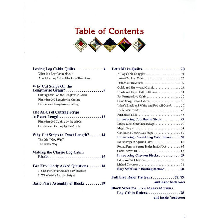 Marti Michell's Log Cabin ABCs Quilt Book teaches quilters the basics of log cabin quilting while adding modern techniques. Log Cabin ABCs includes 14 quilt patterns using different variations of the popular log cabin block, including Courthouse Steps, Curved Log Cabin, and Chevron. Author Marti Michell takes you step-by-step through each pattern and provides tips and tricks for cutting, piecing, and adapting blocks for larger sizes.