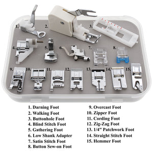 This is a set of 14 essential snap-on presser feet, a low shank adaptor and a hard plastic stackable carrying case for the sewist of any skill level. Included feet are: All Purpose/Zig Zag Foot, Buttonhole Foot, Satin Stitch Foot, Quilting/Straight Foot, Sew-on Button Foot, Zipper Foot, Hemmer Foot, Blind Stitch Foot, Cording Foot, Overcast Foot, 1/4" Patchwork Foot, Darning Foot/Low Shank, Gathering Foot and a Walking Foot. Although your machine is low shank, due to some machines having a shorter needle clamp screw, the walking foot may not be compatible with your machine.