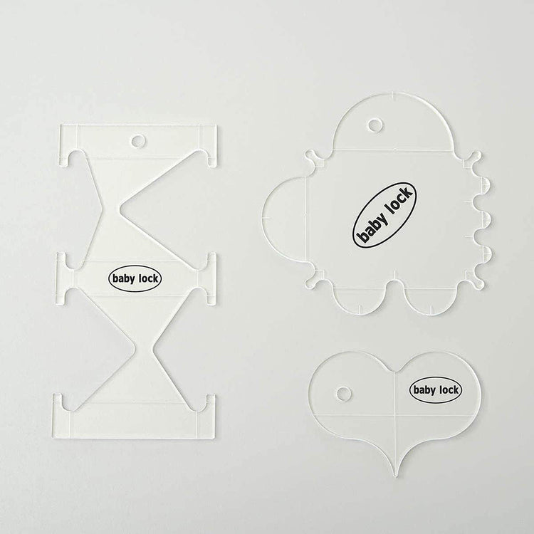 Expand your quilting capabilities with the Baby Lock Ruler Expansion Set. These templates are perfect for any sewer looking to add new designs and styles to their quilts. Set Includes 3" Triangle Swag Chain, 4 Size Clamshell Ruler, and Mini Heart.