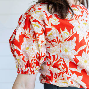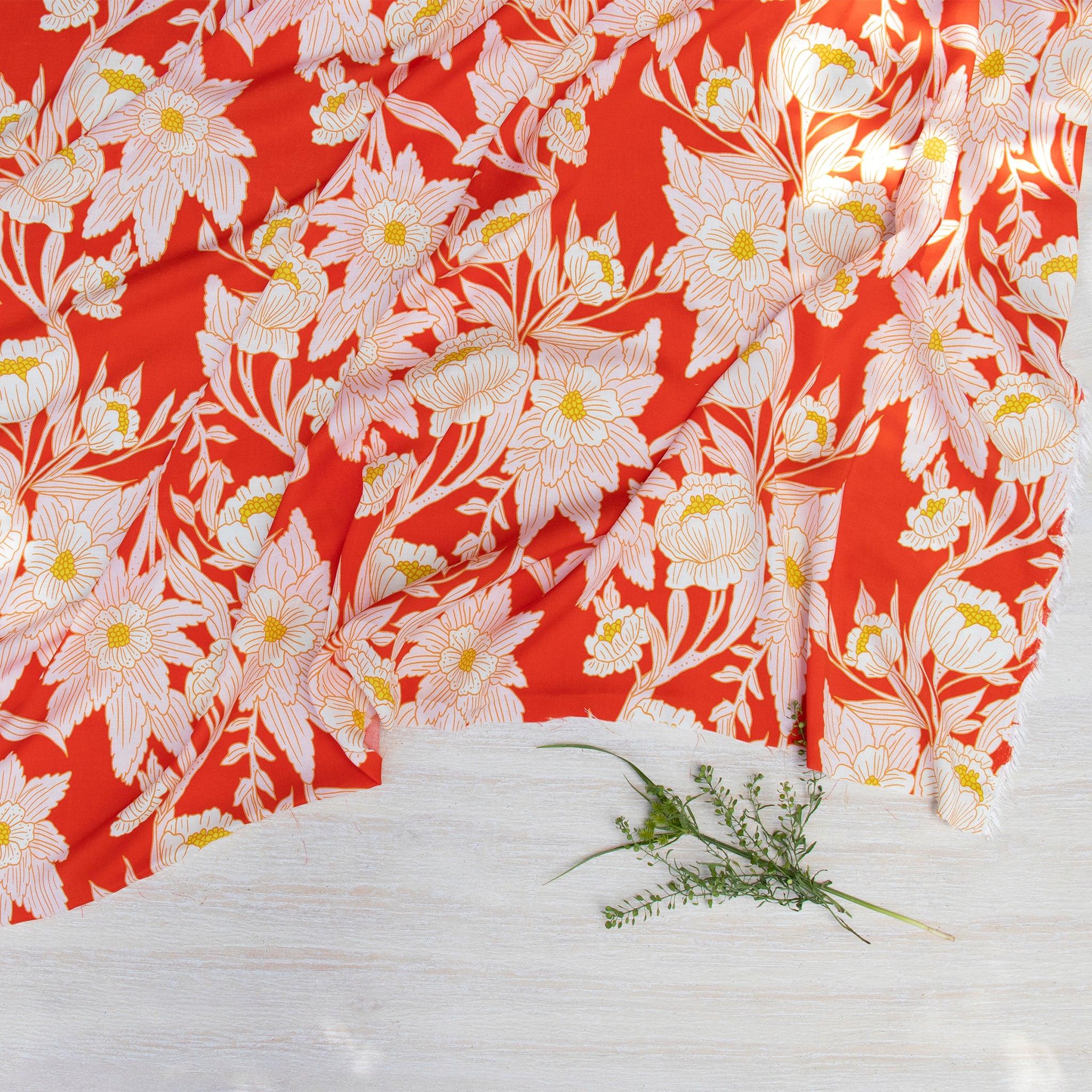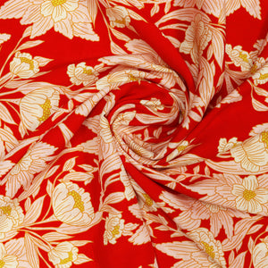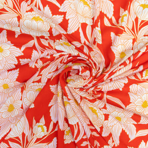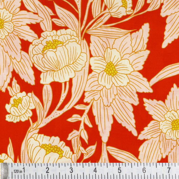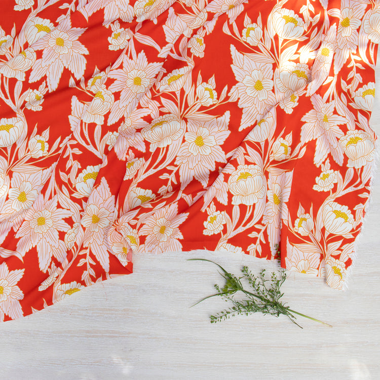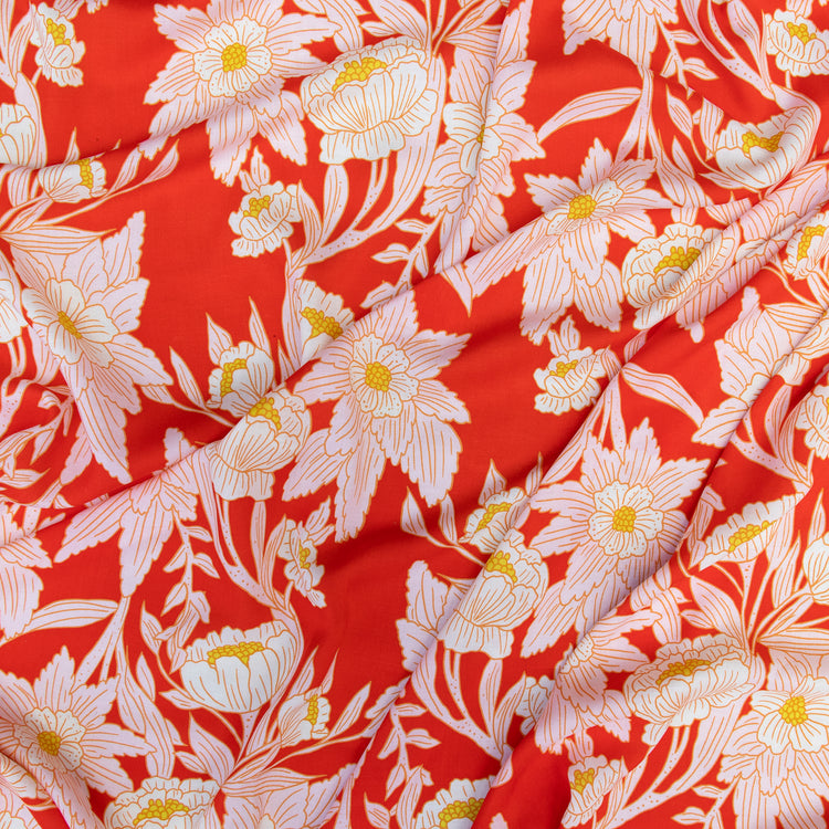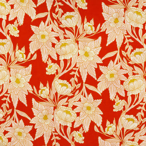 Turn heads with the vibrant charm of Madison Avenue Blaze from Bari J.'s 365 Fifth Avenue collection. Bold, blooming florals in soft blush and golden hues dance across a fiery red background, evoking the elegance and flair of the 1950s and '60s fashion. Inspired by the iconic department stores of New York City, this statement print is tailor-made for striking garments and stylish home décor alike.