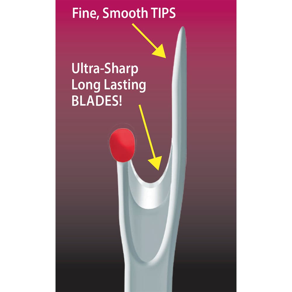 The Magic 2-in-1 Retractable Seam Ripper features an ergonomic handle and two retractable blades; one large and one small. Slide the button up or down to engage the seam rippers. This retractable seam ripper is perfect for storage as well as the sewist on the go.