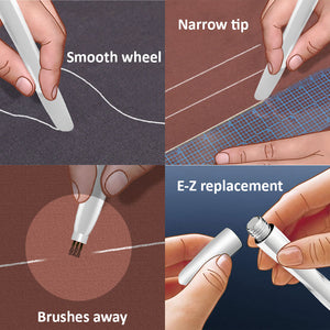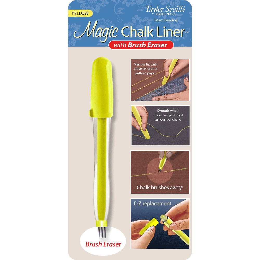 The Taylor Seville Magic Chalk Liner with Brush Eraser features a smooth wheel that won't skip. This chalk liner is as easy to use as a pen, dispensing the perfect amount of chalk and creating precise lines. And thanks to the narrow tip, you can get up close to rulers and pattern paper! The eraser brush allows for any changes to be made, and the Magic Chalk Liner is simple to refill.
