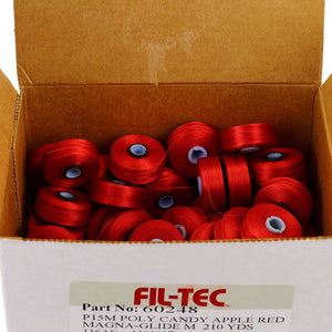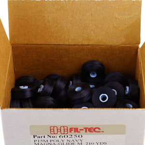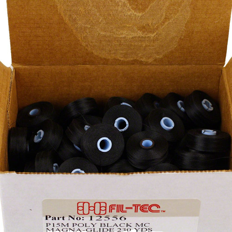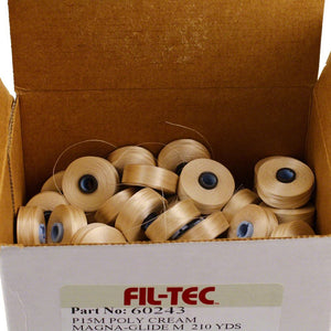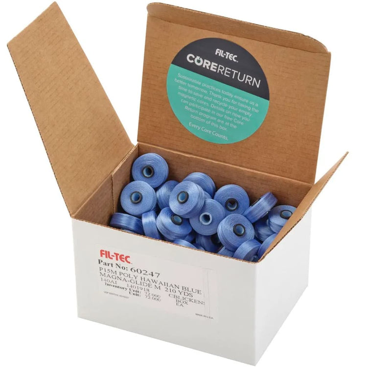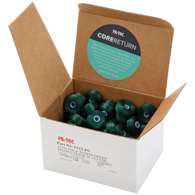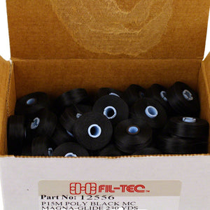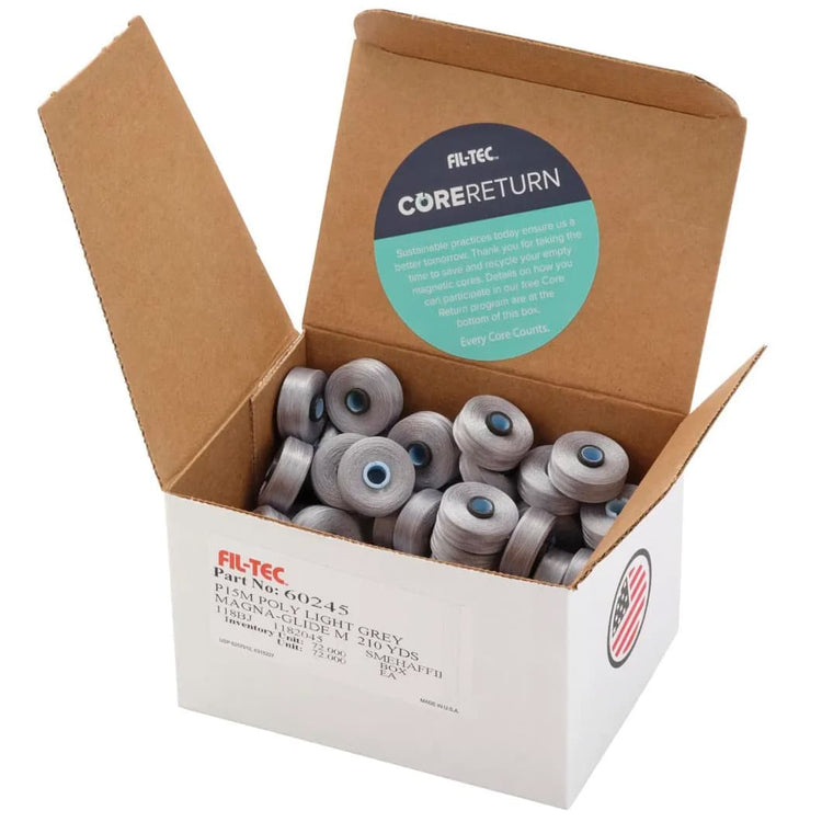 Fil-Tec's Magna-Glide, prewound bobbins are a high quality, 60wt polyester yarn. The patented magnetic core prevents backlash creating consistent stitches and eliminating the need for a backlash spring. (If your bobbin case has a backlash spring, remove spring before inserting this bobbin.) This trouble free bobbin reduces lint and residual build up in the bobbin case. For best results, it's recommended that you use these bobbins in tandem with Glide thread on the spool. Always insert bobbin magnet side down into the metal case. Each bobbin contains 210 yards of thread. Black and white come in 230 yards. Made in the USA.