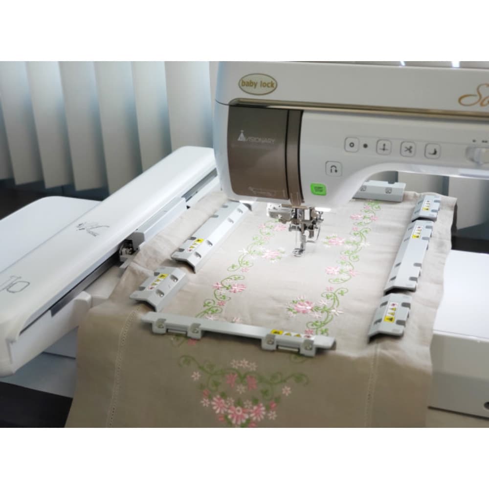 Babylock's Magnetic Frame is the perfect accessory for embroidering on single-needle machines. The magnets make repositioning your fabric for multiple hooping painless. It is a must-have for quilting or large embroidery designs! This 7" X 14" Magnetic Embroidery Hoop slides easily into your Baby Lock machine module.