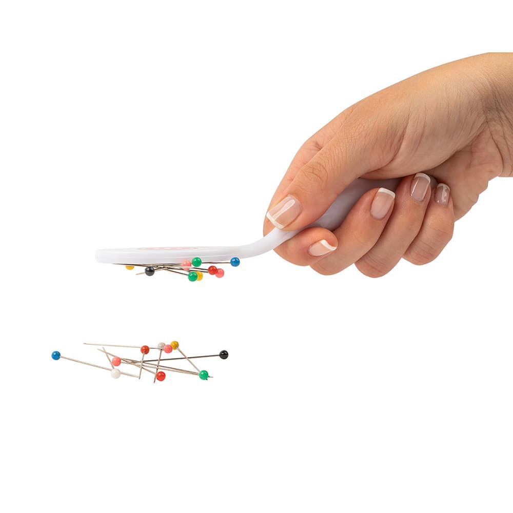 The Magnetic Pin Pal, by Singer, is a handy tool to keep in your sewing kit. The handle shape makes the Pin Pal easy to grip, while the strong magnet simplifies gathering your pins and needles. The pleasant Paisley pattern gives the Magnetic Pin Pal character. Included with the tool is a package of 25 ball head pins.