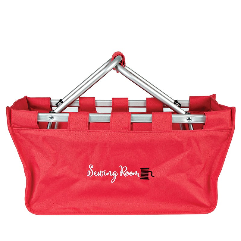 Keep your sewing supplies and notions organized in this red market tote. This canvas bag is equipped with an aluminum frame and handles, and has 'Sewing Room' embroidered on the side. The Market Tote measures approximately 18in long by 11-1/2in deep and 9in tall. Store fabrics or your latest sewing project in the Market Bag for easy transportation.