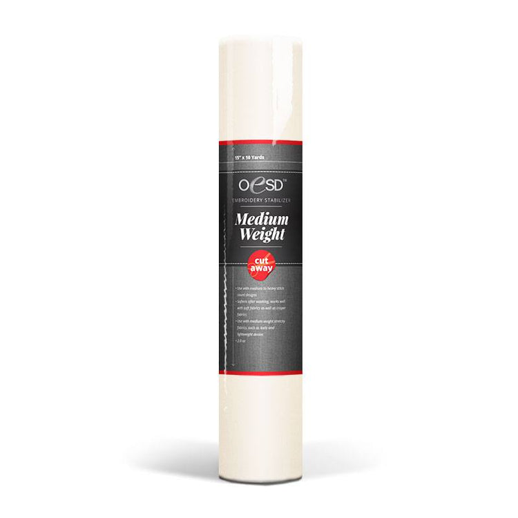 High quality, Medium Weight, Cut-Away Stabilizer from OESD. This cut-away stabilizer is ideal for medium weight knits and lightweight denim. Perfect for soft or crisp fabrics as it softens after being washed. Use this stabilizer to embroider low to medium stitch count designs. Each roll contains ten yards of 15", medium weight, cut-away stabilizer.