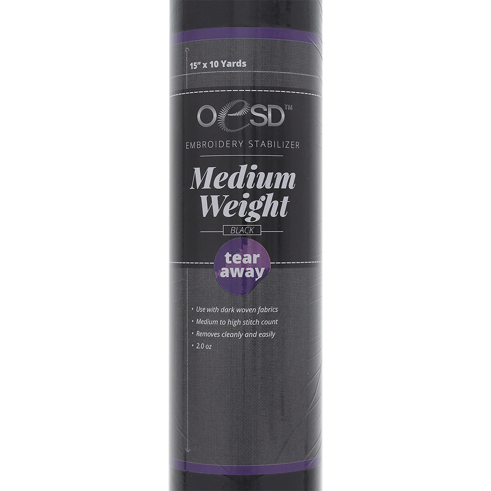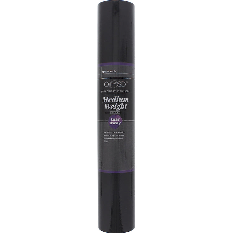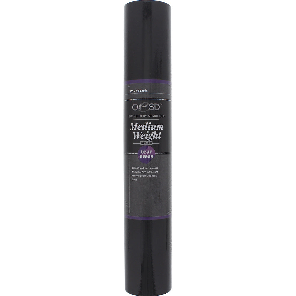 High quality, medium weight, tear-away stabilizer in black. This OESD stabilizer is ideal for use on dark, woven fabric. Strong enough to hold medium to high stitch count designs. Easily tears away. Each roll contains ten yards of 15" wide, black stabilizer.