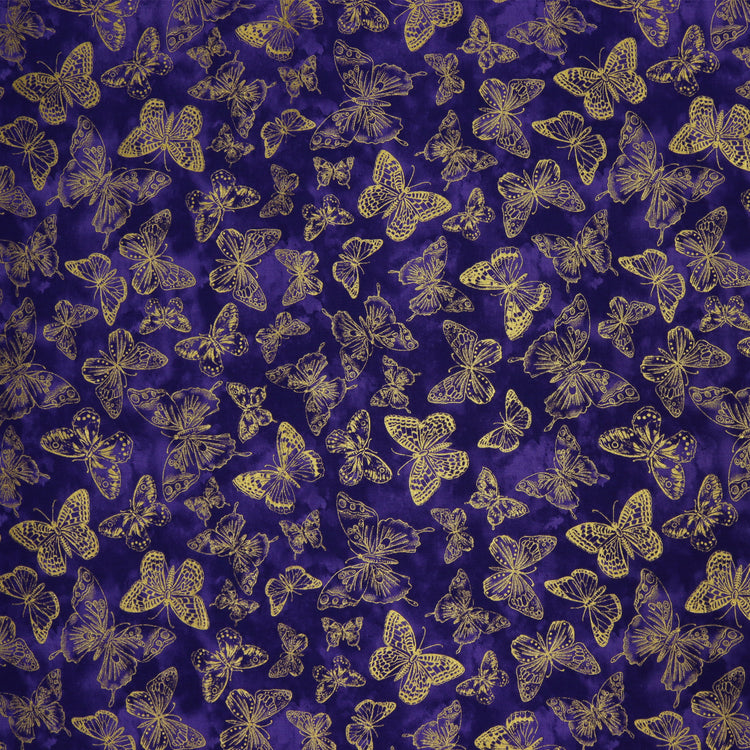 Dramatic and enchanting, Butterfly Impressions Purple captures the magic of twilight in a garden. A lush plum background sets the stage for a mesmerizing flurry of gold-outlined butterflies in varying sizes and patterns. The high contrast and radiant gold detailing make this print a captivating option for focal blocks, borders, or luxurious accessories. It’s a fabric that feels both regal and ethereal—perfect for projects that require a bold yet elegant aesthetic.