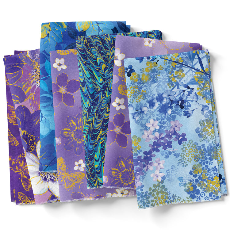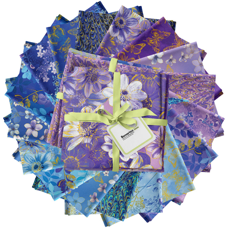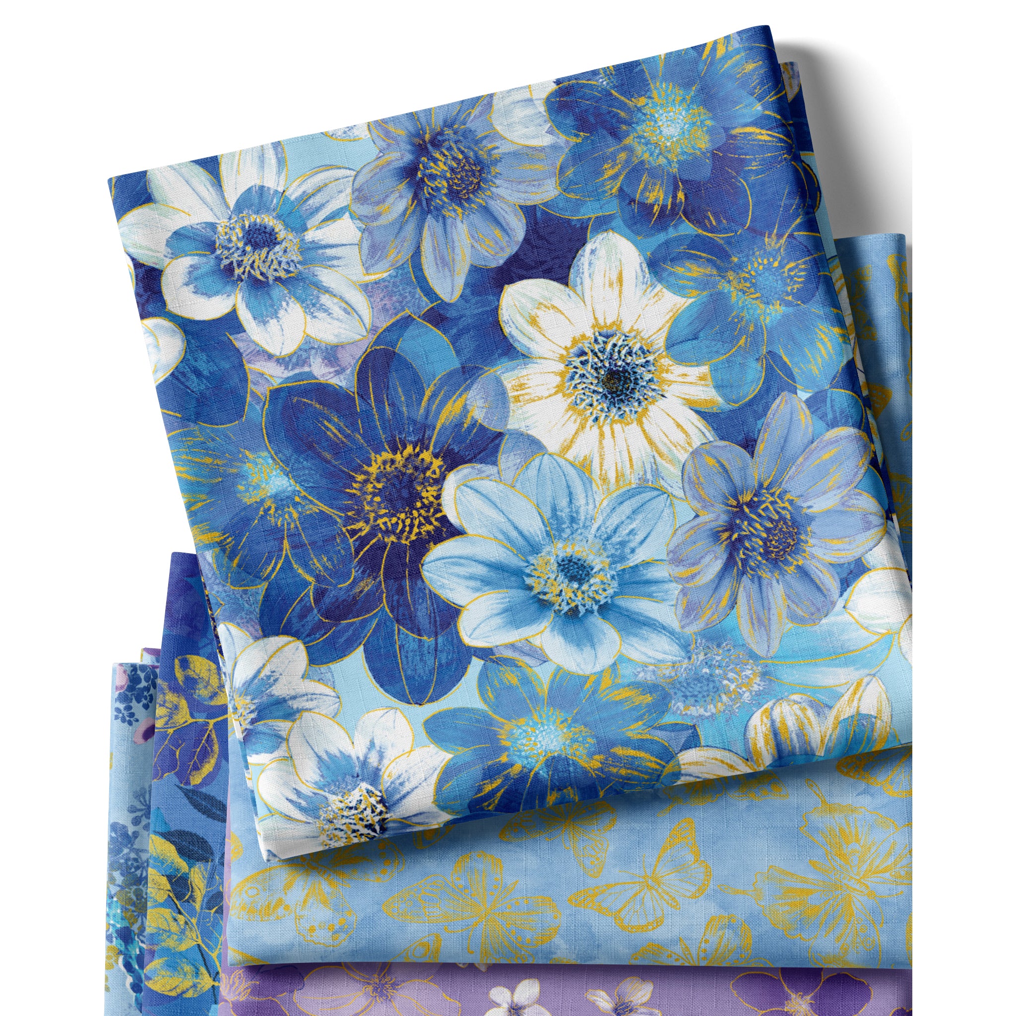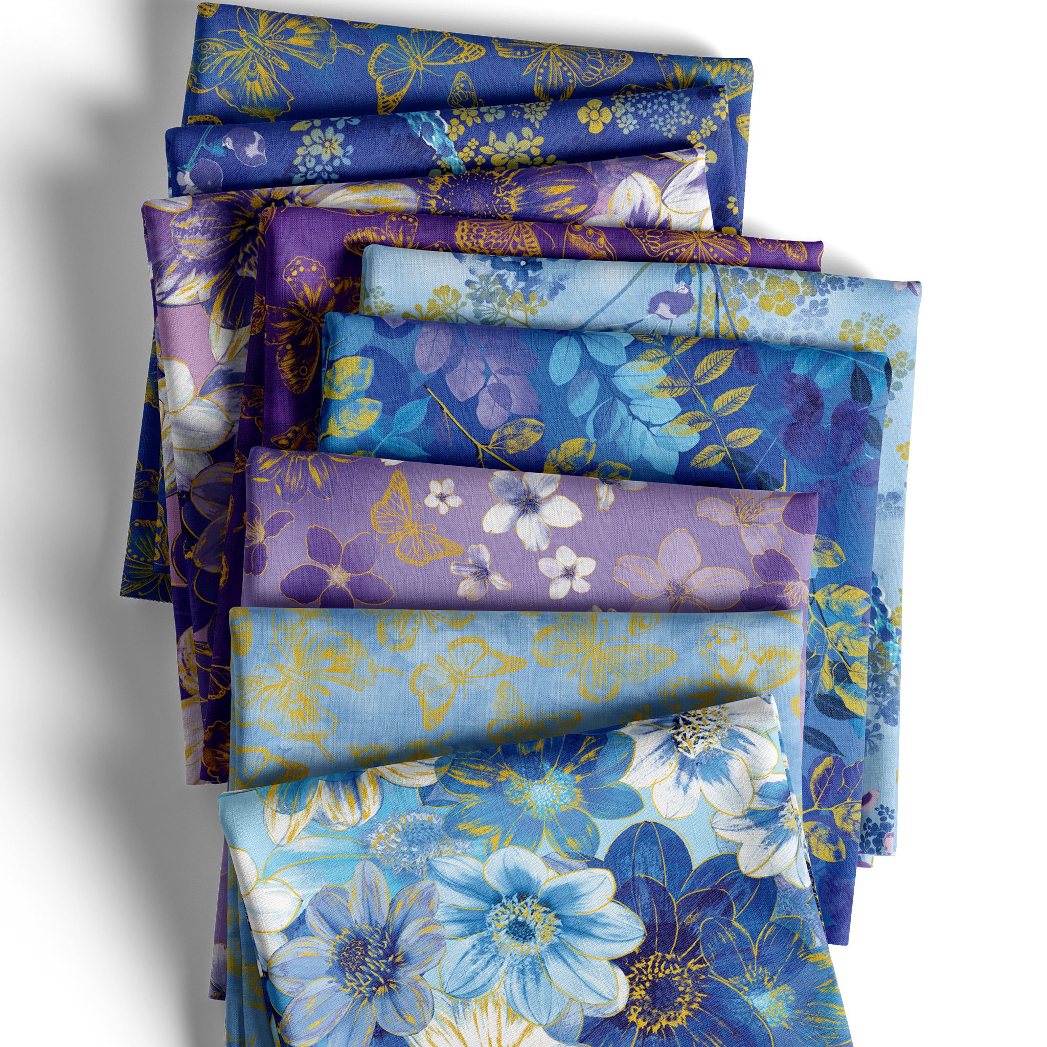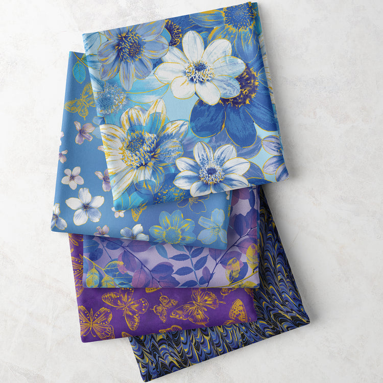 The Metallic Impressions fabric collection by Kanvas Studio for Benartex is a luminous celebration of florals, butterflies, and botanicals—all kissed with elegant metallic gold detailing. Printed on 100% cotton and measuring approximately 44" wide, these fabrics shimmer in shades of lilac, cobalt, and cerulean, delivering an ethereal quality that elevates any sewing or quilting project. At the heart of the collection is a bold floral cascade print, perfect as a focal point in quilts or even transformed into a stunning skirt. Surrounding it are coordinating designs in a range of scales, from delicate blossoms and leafy silhouettes to graceful butterflies and rich marble textures. Each print is thoughtfully accented with touches of gold that glint beautifully in the light, giving the entire collection a sense of sophistication and magic.