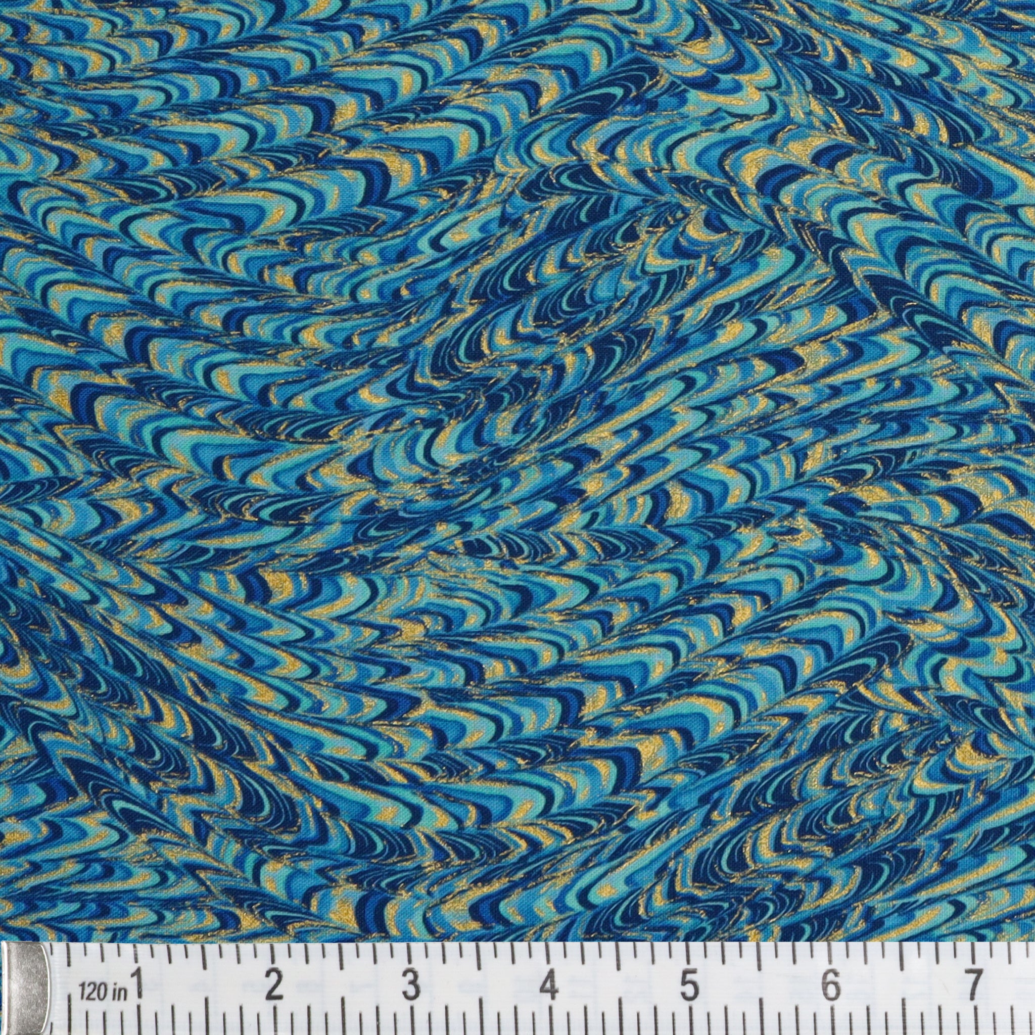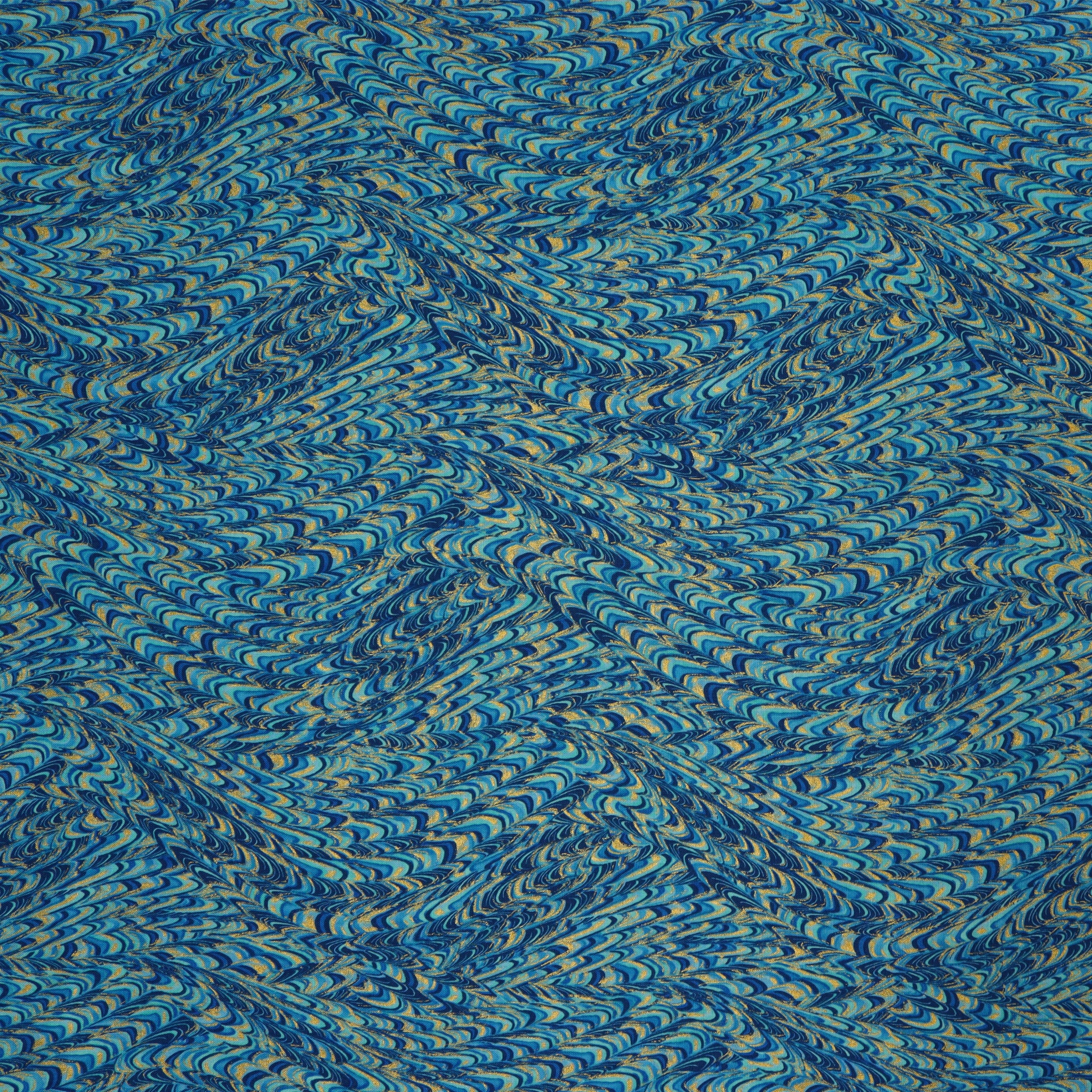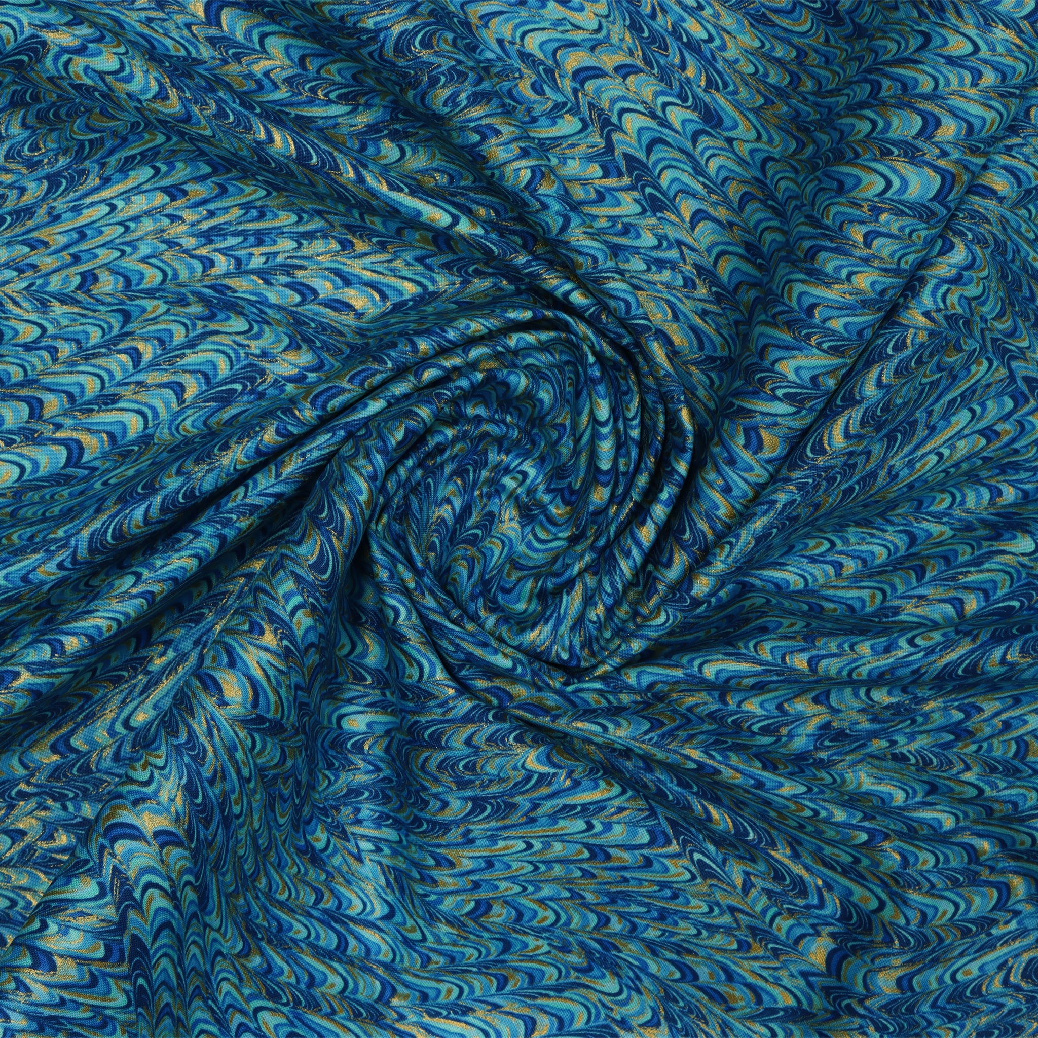 The Marble Impressions Peacock fabric dances with vibrant layers of teal, aqua, navy, and sky, blending together in a hypnotic marbled swirl. Glints of metallic gold weave through each curve, adding a luminous highlight that gives the fabric depth and dimension. This richly saturated print brings a dynamic texture to any project, whether you're using it as a bold border, a dramatic accent, or even the main star of your quilt. The fluid motion of the design creates visual movement that feels both energetic and elegant, perfect for adding a touch of luxury to your creative work.
