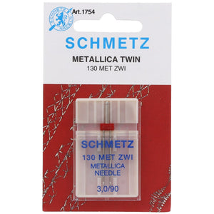 Schmetz 130 MET ZWI Metallic Twin Needles are two metallic needles mounted on one shank that create two rows of stitches simultaneously. These needles are a must for sewing with metallic threads. The elongated eye and enlarged groove make this needle immaculate for trouble-free sewing and embroidery with the more fragile metallic threads. It has a double-sized, polished, and Teflon-coated eye to guarantee a smooth flow of the thread. Ever struggled with metallics before and blamed the thread? Try again with this specialty needle for trouble-free embellishment with these stunning but delicate threads. Please Note: In order to use a Twin Needle, your machine must have a front or top loading bobbin, a zig-zag stitch, AND the flat side of the needle shank facing the back of your machine.