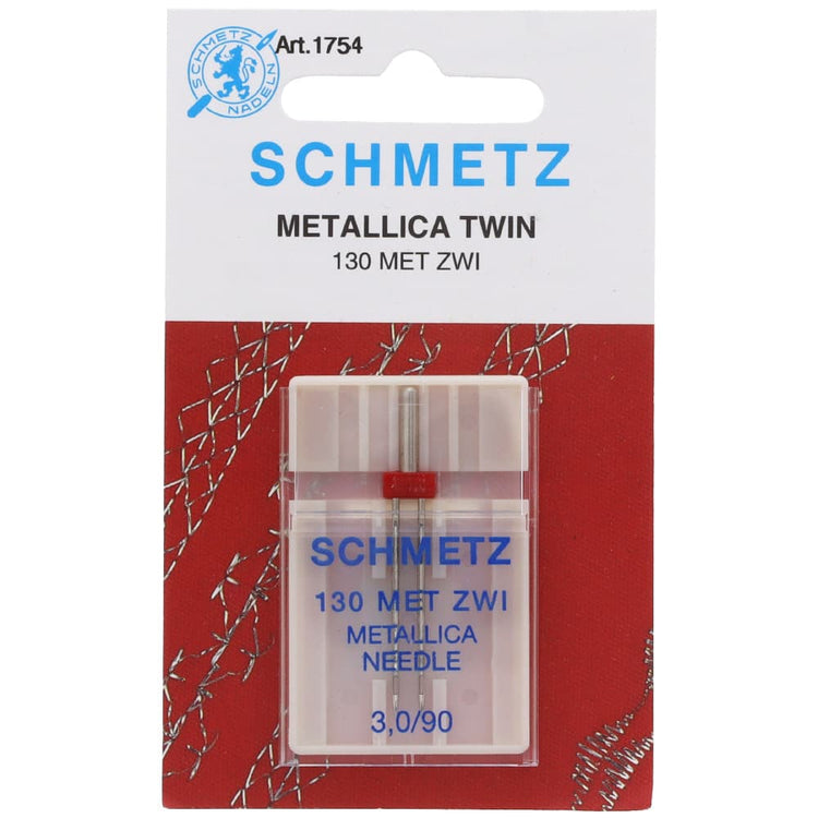 Most Schmetz Needles include two color-coded bands just below the shank. The top color indicates the type of needle, and the lower color indicates the size. The Schmetz Metallic Twin Needle does not have a color code. Schmetz 130 MET ZWI Metallic Twin Needle comes as one needle in a plastic case that slides shut for safe storage. The needle system, needle type, and needle size are printed on the front of the case.