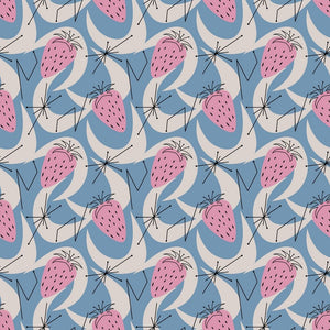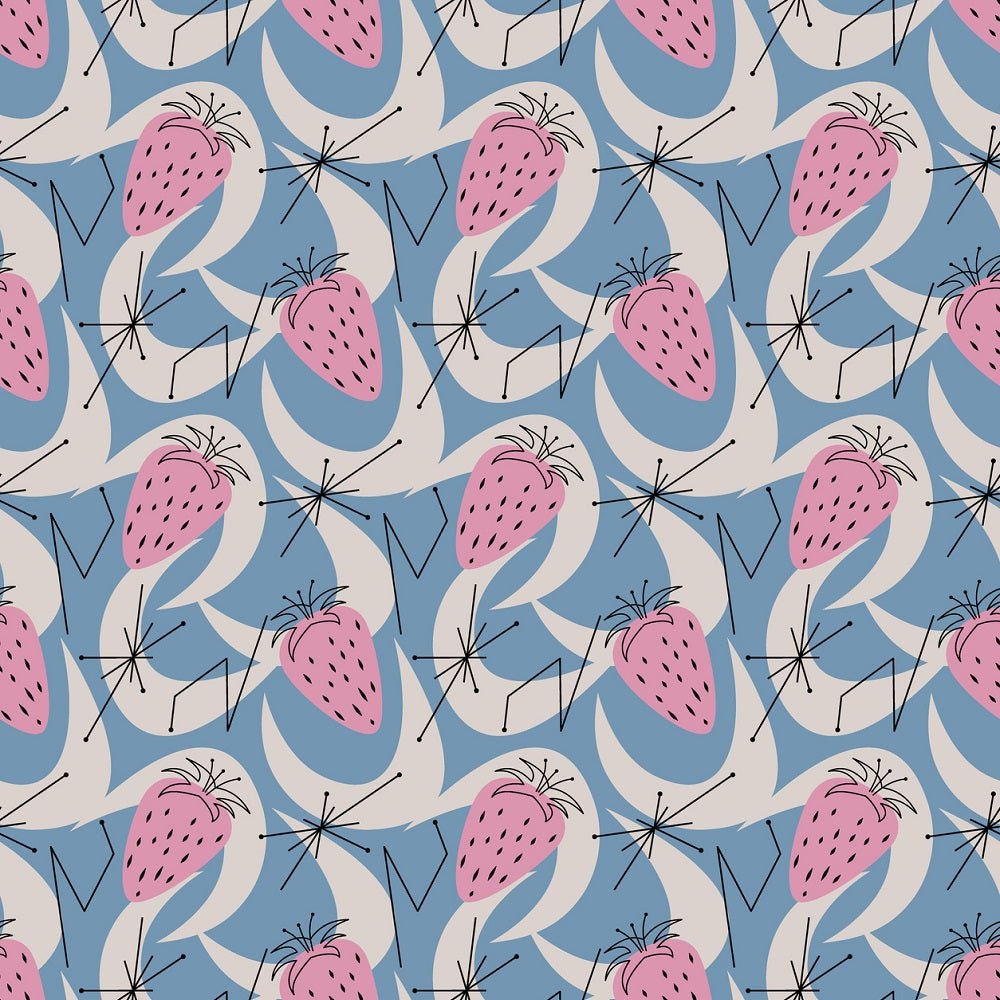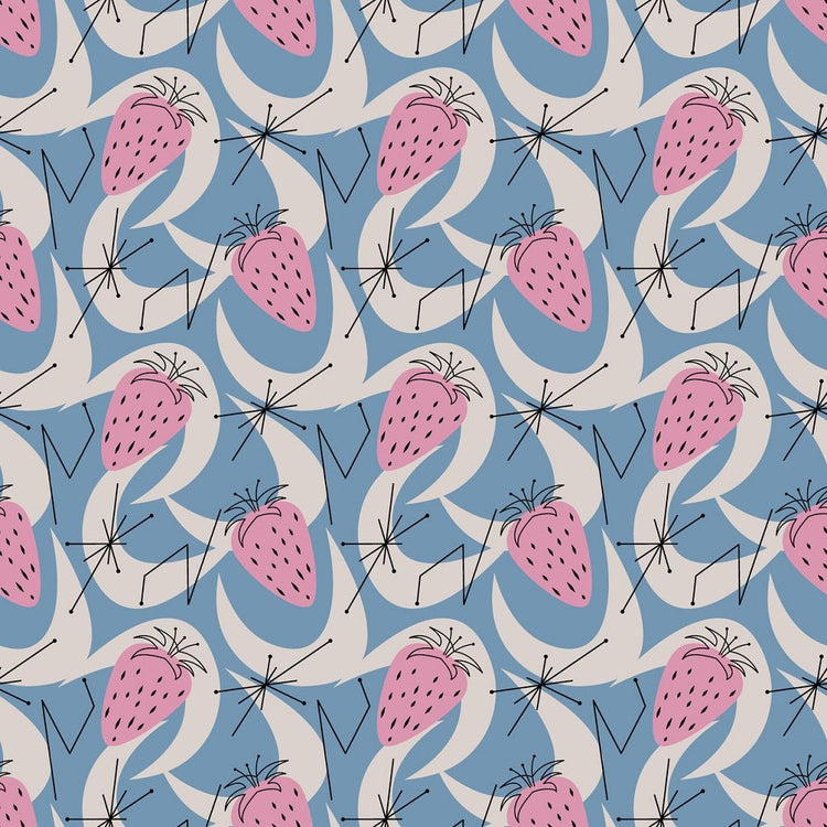 The Mid-Century Modern Abstraction and Strawberries Fabric is part of the Retro Fabric Collection printed by Sew Creative Fabrics. Digitally Printed on 100% cotton.