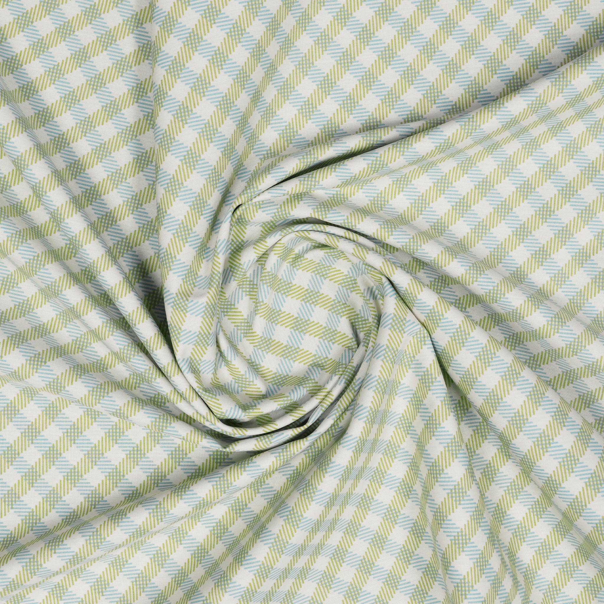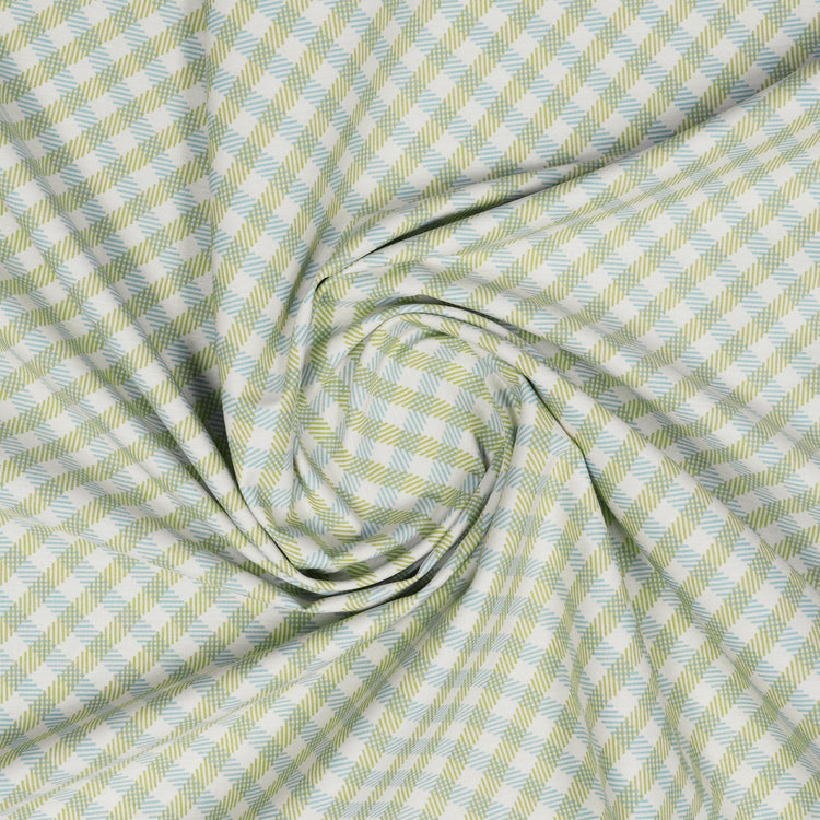 Interwoven Grass is a fresh, geometric print that brings subtle texture and movement to your sewing projects. Diagonal bands of soft green and muted blue lines form a woven pattern on a warm cream background, creating a look that's both structured and organic. This versatile design works beautifully as a blender, border, or background, adding visual interest without overpowering other prints. Interwoven Grass offers a clean, modern touch inspired by natural forms and gentle rhythms.