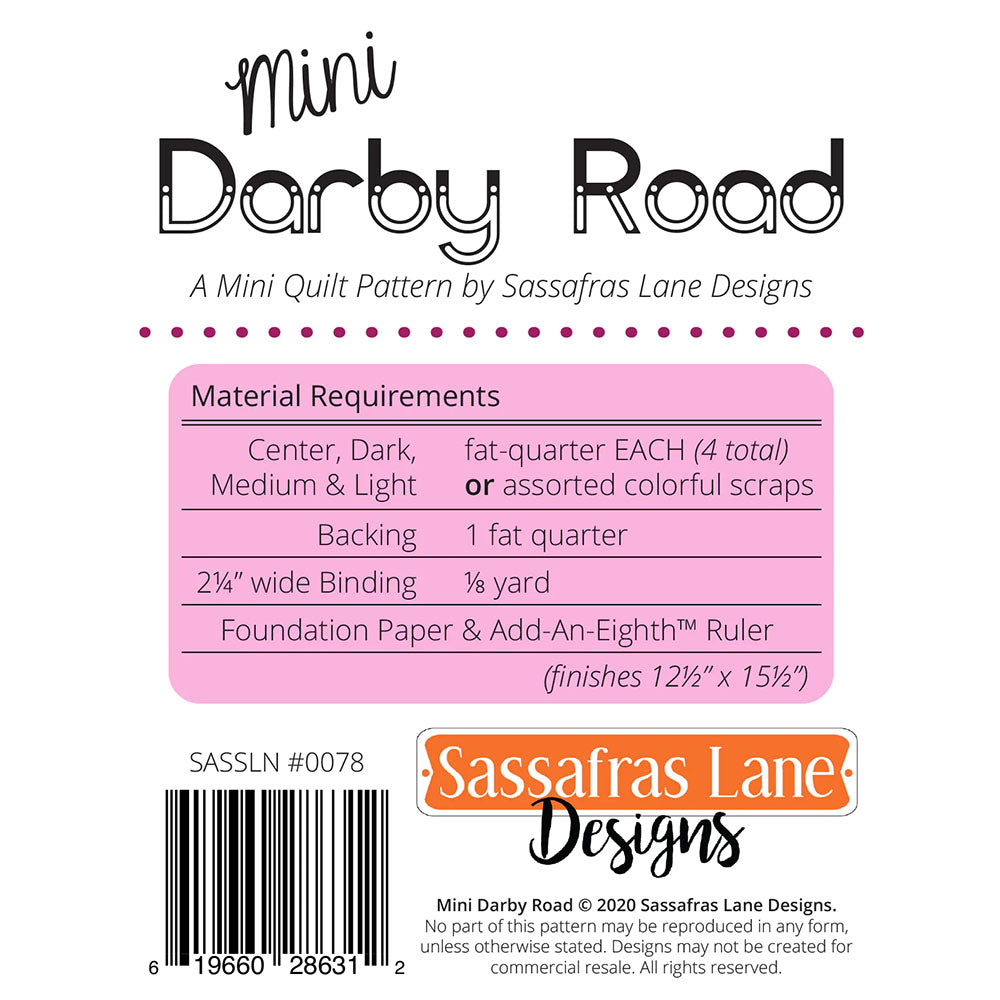 The Mini Darby Road Quilt Pattern by Sassafras Lane Designs is a trouble-free design suited for many individuals. This design is scrap fabric and fat quarter friendly and finishes to be 12-1/2" by 15-1/2". The Mini Darby Road Quilt Pattern by Sassafras Lane Designs also includes a list of suggested materials and step-by-step instructions.