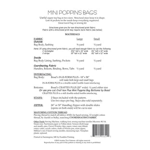 Make these fun Mini Poppins Bags in two sizes with Aunties Two pattern. These bags are perfect for storing cosmetics as well as sewing supplies and notions. The Mini Poppins Bags Pattern includes two prebent bag stays! Aunties Two recommends using a heavyweight fusible stabilizer such as Bosal's Craf-Tex Plus #437BF-9 for a sturdy bag.