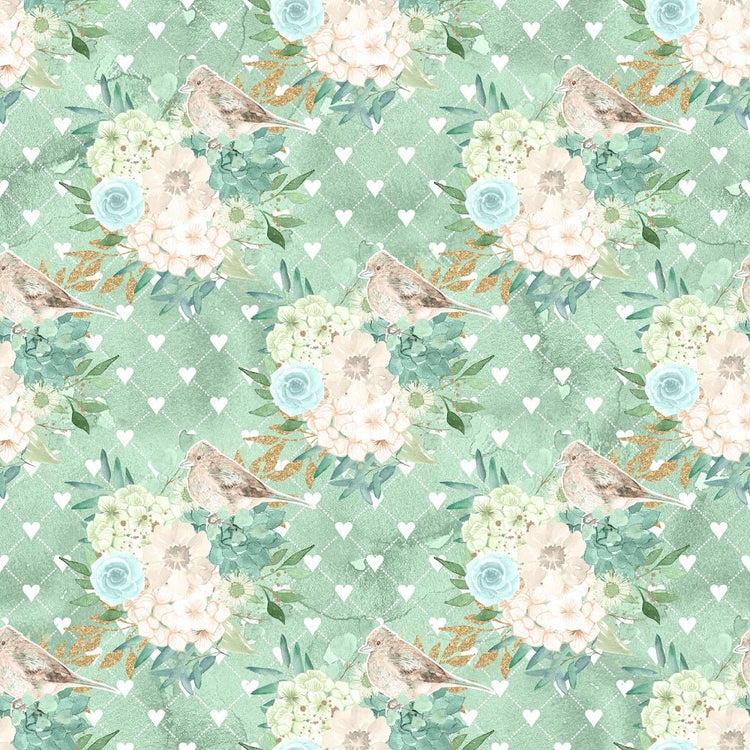 The Mint Dreams Bouquets on Hearts Fabric is part of the Mint Dreams Fabric Collection printed by Sew Creative Fabrics. Digitally Printed on 100% cotton and measures 43-45" wide.