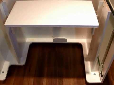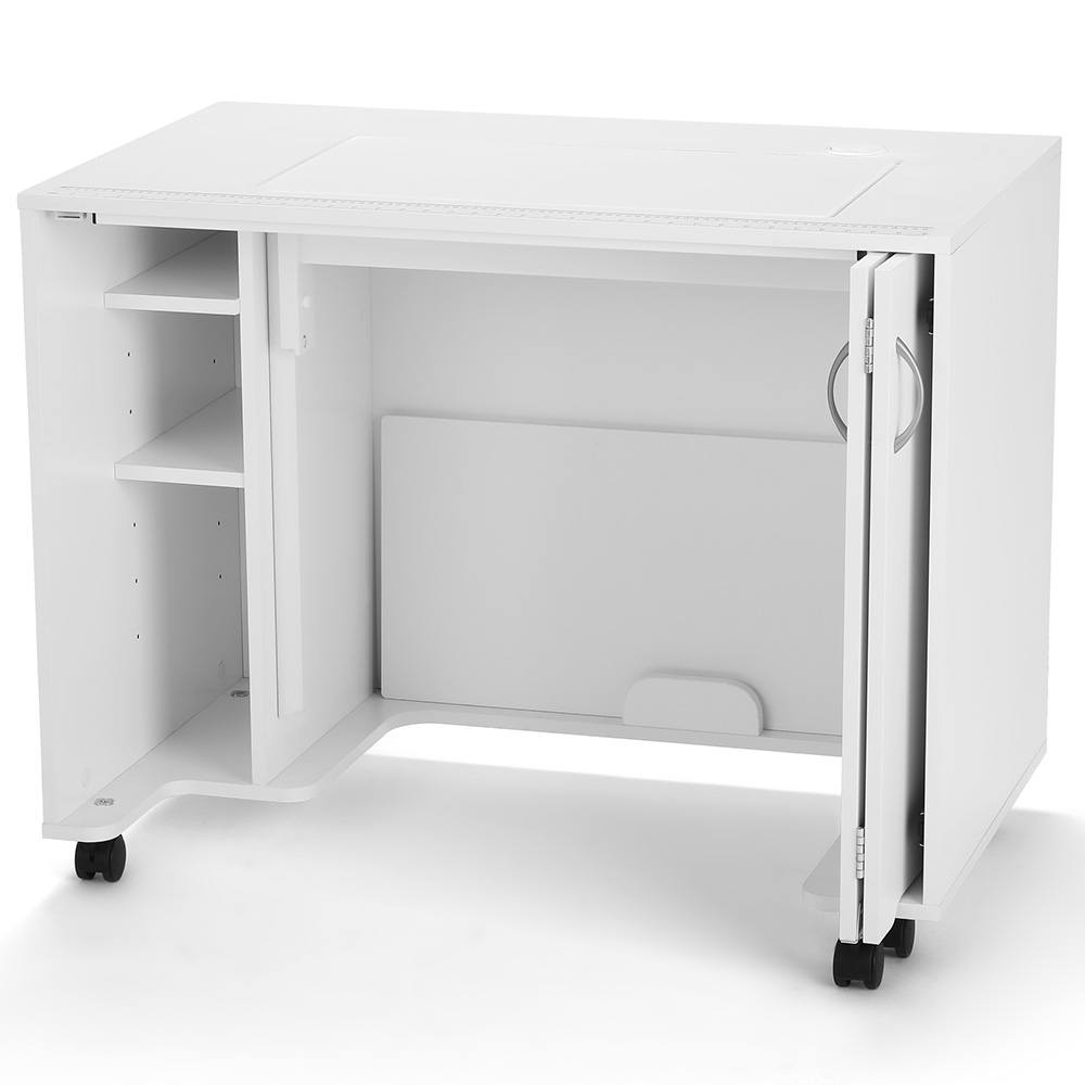 The advantage of the hydraulic lift provides three-tiered positions for your sewing machine, and the large opening accommodates up to 55 pounds. The first top position is specifically for free-arm sewing. The next tier down provides a flat tabletop surface, and when paired with the insert, your project will glide effortlessly from the machine to the tabletop. The lowest tier position offers a space for machine storage inside the MOD Sewing Cabinet.