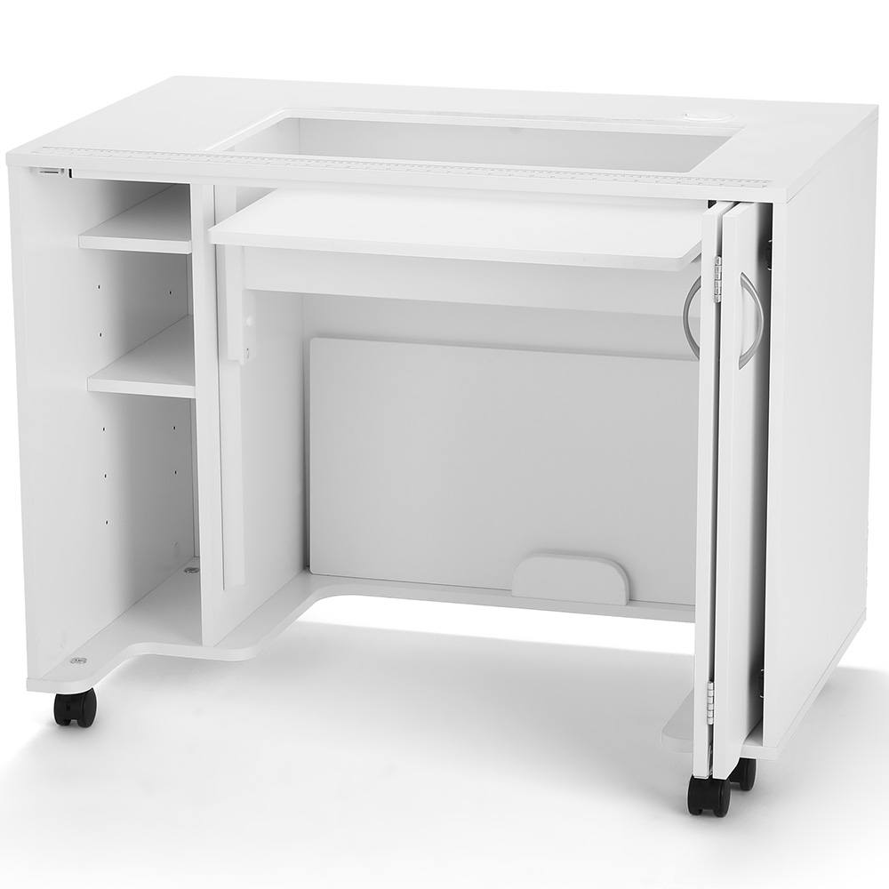 The retractable, hinged pocket door slides in and out, securing your machine while in the storage position. The MOD Sewing Cabinet goes excellent against a wall, and the sturdy design has heavy-duty locking casters for a solid workstation while allowing easy mobility. Need a generous, flush work surface for extensive projects? Secure the pocket doors and fix the wood cover over the sewing well to create the ultimate working surface! The finish is a strong melamine laminate that is scratch-resistant, moisture-resistant, and easy to clean.