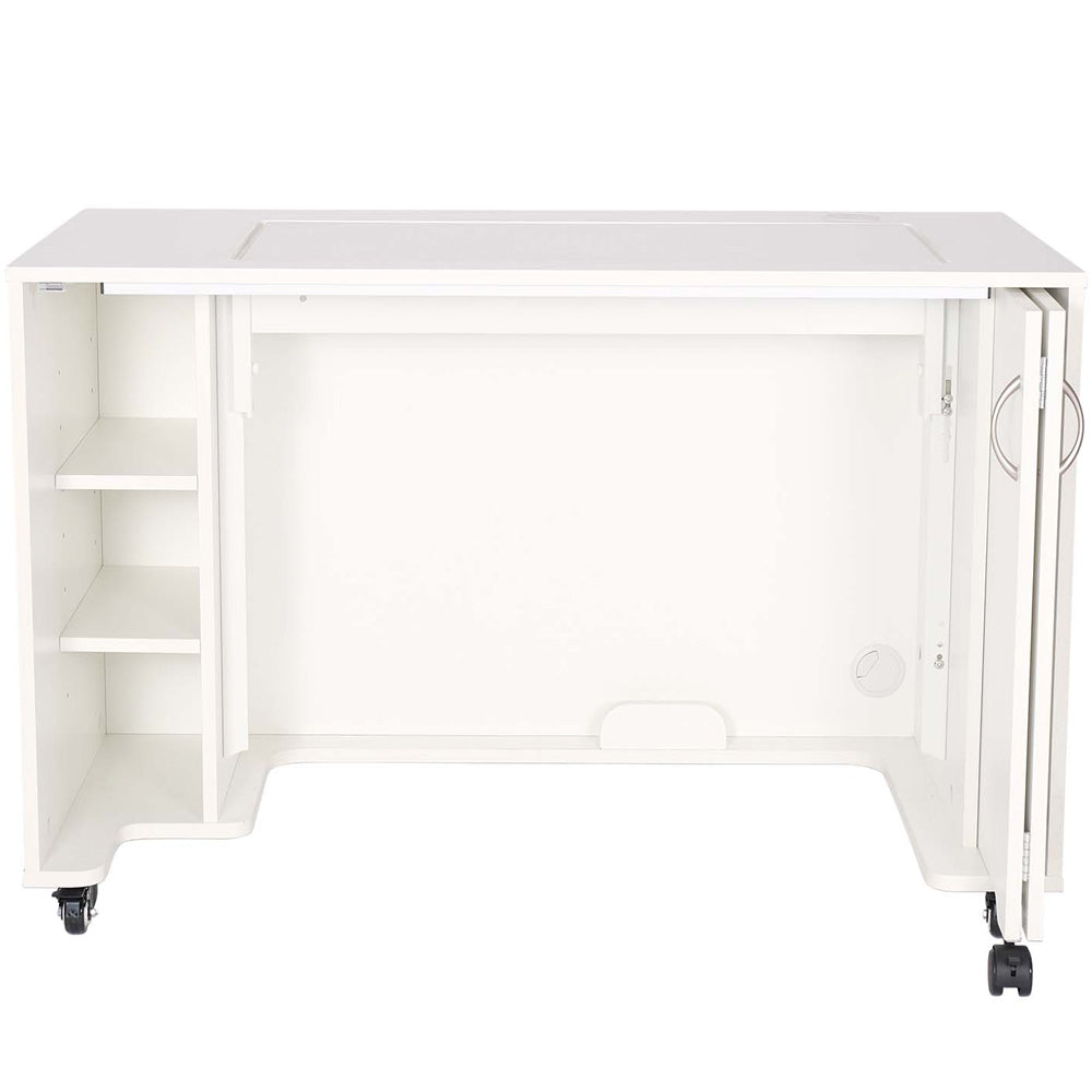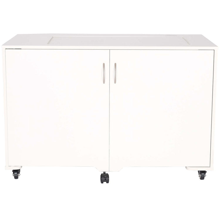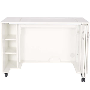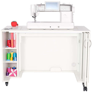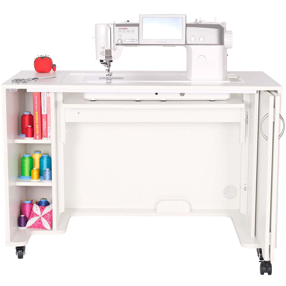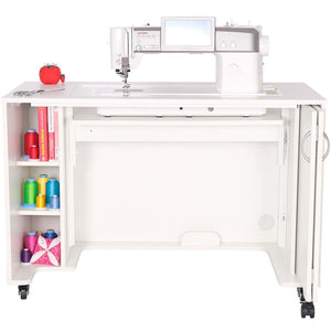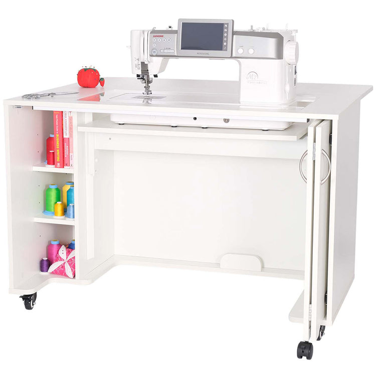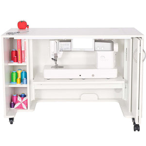 One of the most remarkable features of the MOD XL Sewing Cabinet is its compact yet expandable. When not in use, it easily collapses and stores out of the way as the heavy-duty locking casters provide easy mobility. When open, you'll enjoy two height-adjustable shelves for storage, a pocket door that ensures your machine is protected, and a wooden panel to place over the sewing well, making your all-over work surface increase.