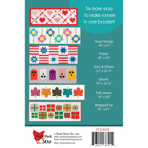 Designed by Allison Harris, the Modern Holiday Table Runners Vol 2 from Cluck Cluck Sew is a booklet including six adorable seasonal-themed table runners. The booklet contains 22 full-color pages, including runners for Valentine's Day, Spring, 4th of July, Fall, Halloween, and Christmas. These patterns are quick and straightforward, making them perfect for beginner-level sewists. The Modern Holiday Table Runners Vol 2 has detailed instructions and a suggested list of materials.