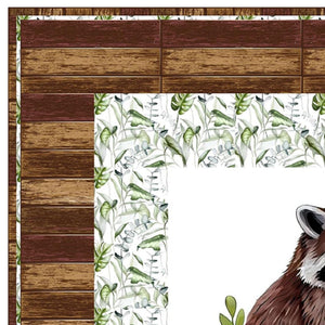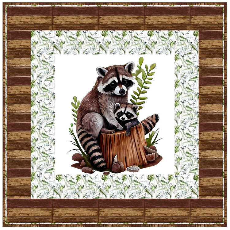 The Mom and Baby Raccoon Sitting on a Stump Wall Hanging includes everything that you need to make the quilt - the instructions and a total of 4 yards of fabric and a 23" panel. It has two borders and is finished with a flange binding. Batting is sold separately. The finished size of this quilt is 42" x 42".
