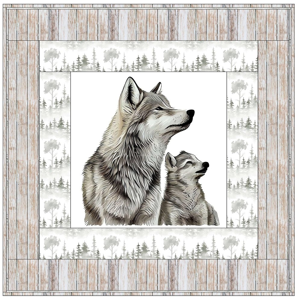 The Mom and Baby Wolf in the Woods Wall Hanging includes everything that you need to make the quilt - the instructions and a total of 4 yards of fabric and a 23" panel. It has two borders and is finished with a flange binding. Batting is sold separately. The finished size of this quilt is 42" x 42".