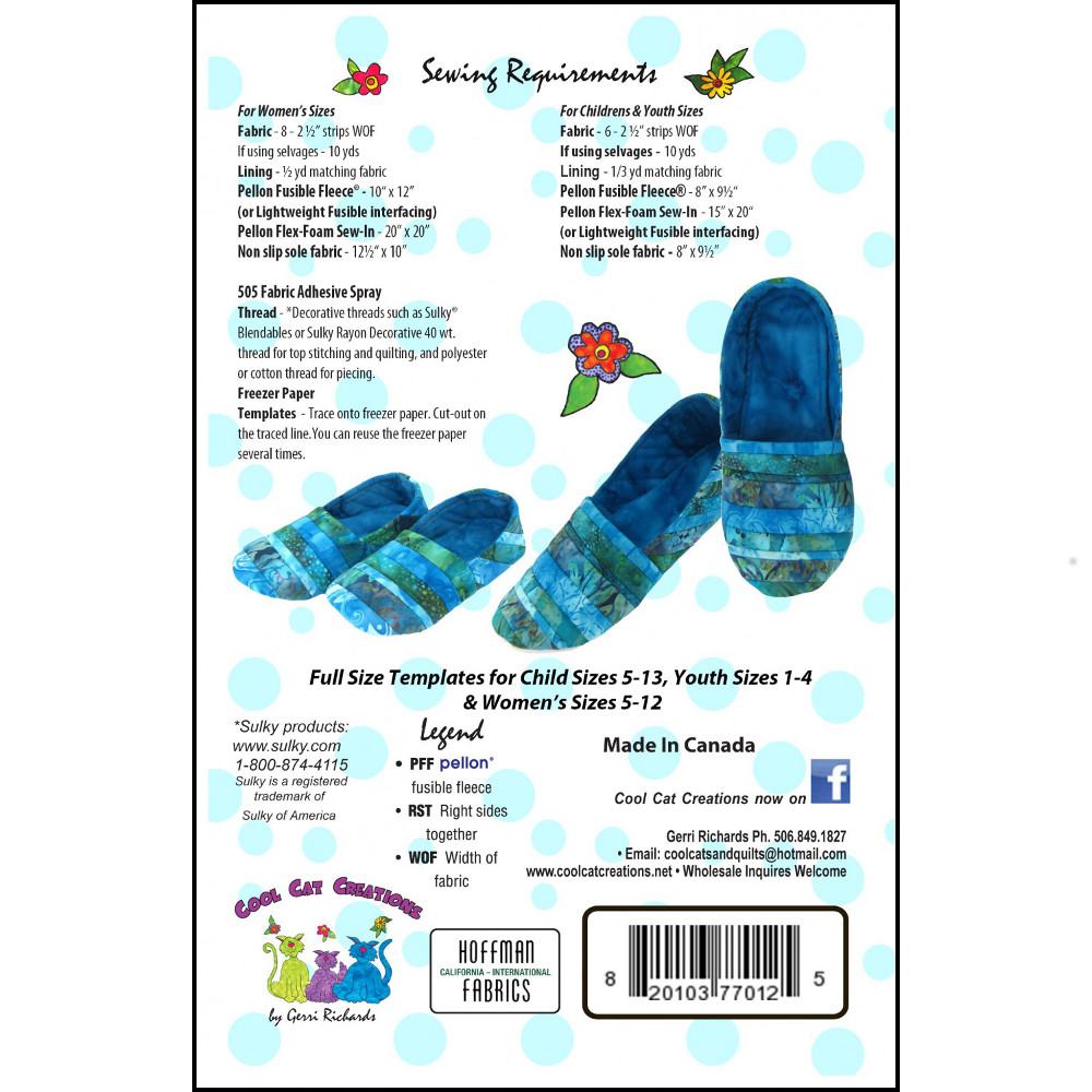 Enjoy sewing these cozy slippers designed by Gerri Richards. This pattern makes slippers for children in sizes 5-13, youth 1-4, and women's 5-12. Included are full-size templates as well as fabric and material requirements for each size.