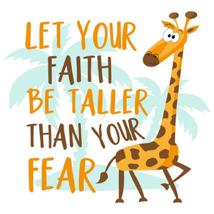 The Faith, Motivational Giraffe Fabric Panel is part of the Faith Collection printed by Sewing Parts Online. Digitally Printed on 100% cotton. The fabric panel includes text saying "Let Your Faith be Taller Than your Fear." This panel is available in 6 different sizes: