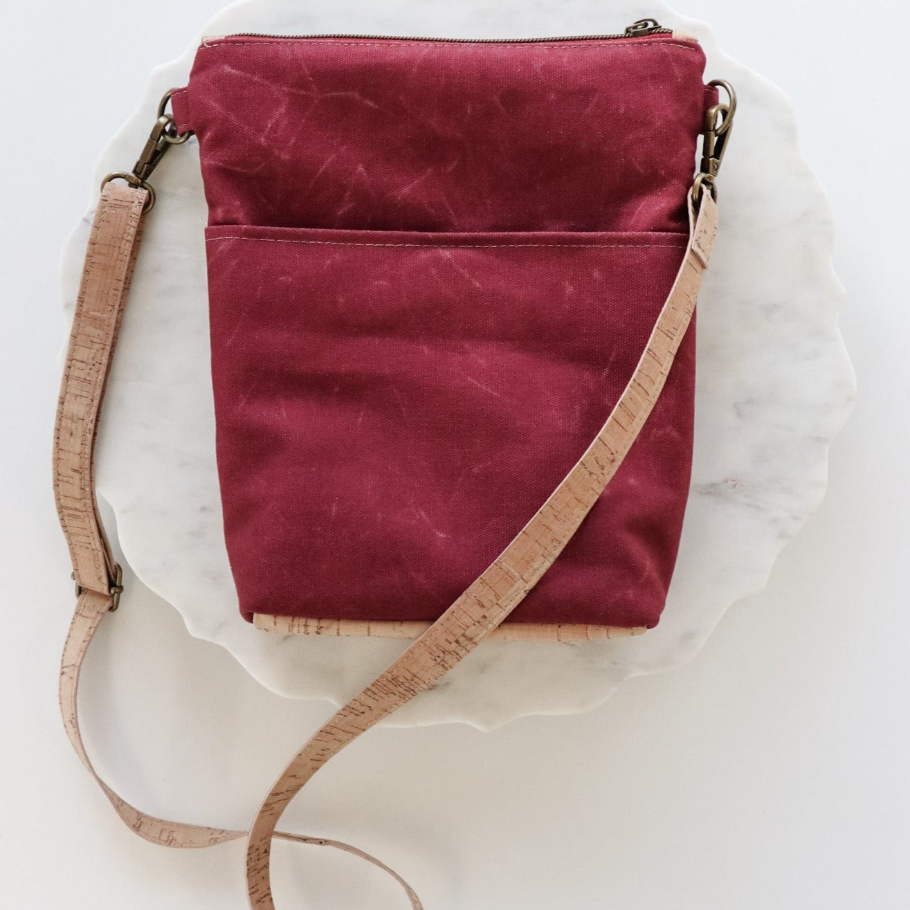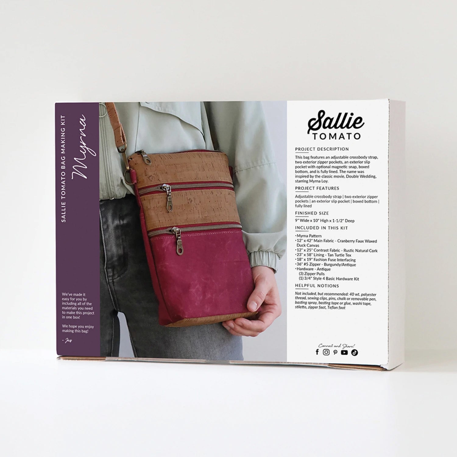 This curated kit includes all the materials needed to sew your own Myrna crossbody: Cranberry Faux Waxed Duck Canvas for the main body, Rustic Natural Cork for the contrast, Tan Turtle Tex for the lining, Fashion Fuse interfacing for structure, a coordinating 36" #5 burgundy-and-antique zipper with three pulls, and Antique-finish hardware—including a complete ¾" Style 4 Basic Hardware Kit. When finished, your bag measures 9" wide × 10" high × 1½" deep, giving you plenty of space for everyday essentials while maintaining a sleek, streamlined silhouette. A satisfying make with a polished, boutique look—perfect for gifting or for treating yourself.