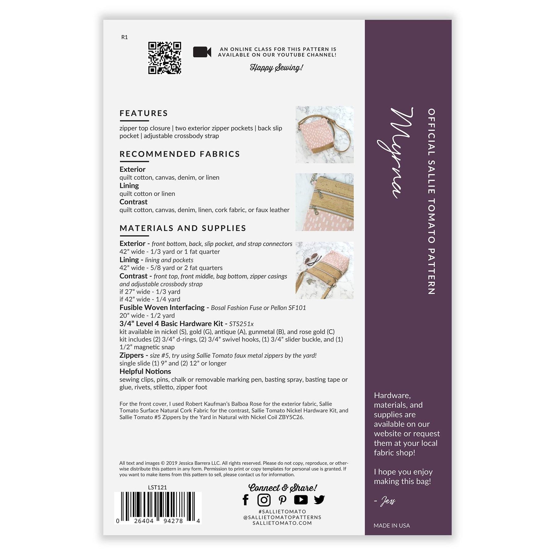 Myrna Zippy Crossbody Bag Pattern Kit Details