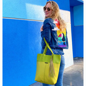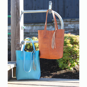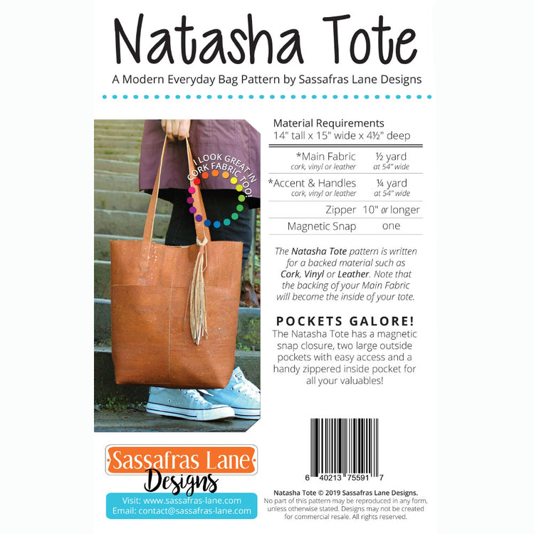 The Natasha Tote Bag is the superior grab-and-go bag to carry to work, out on the town, or even on vacation getaways! This design can be created in a fabric-backed cork fabric, vinyl, or leather and features a magnetic snap closure at the top, a convenient hanging inside zippered pocket, and a boxed bottom. The Natasha Tote Bag Pattern includes detailed instructions and a suggested list of materials. The finished bag measures 15" wide, 14" tall, and 4.5" deep. Recommended for any level sewists.